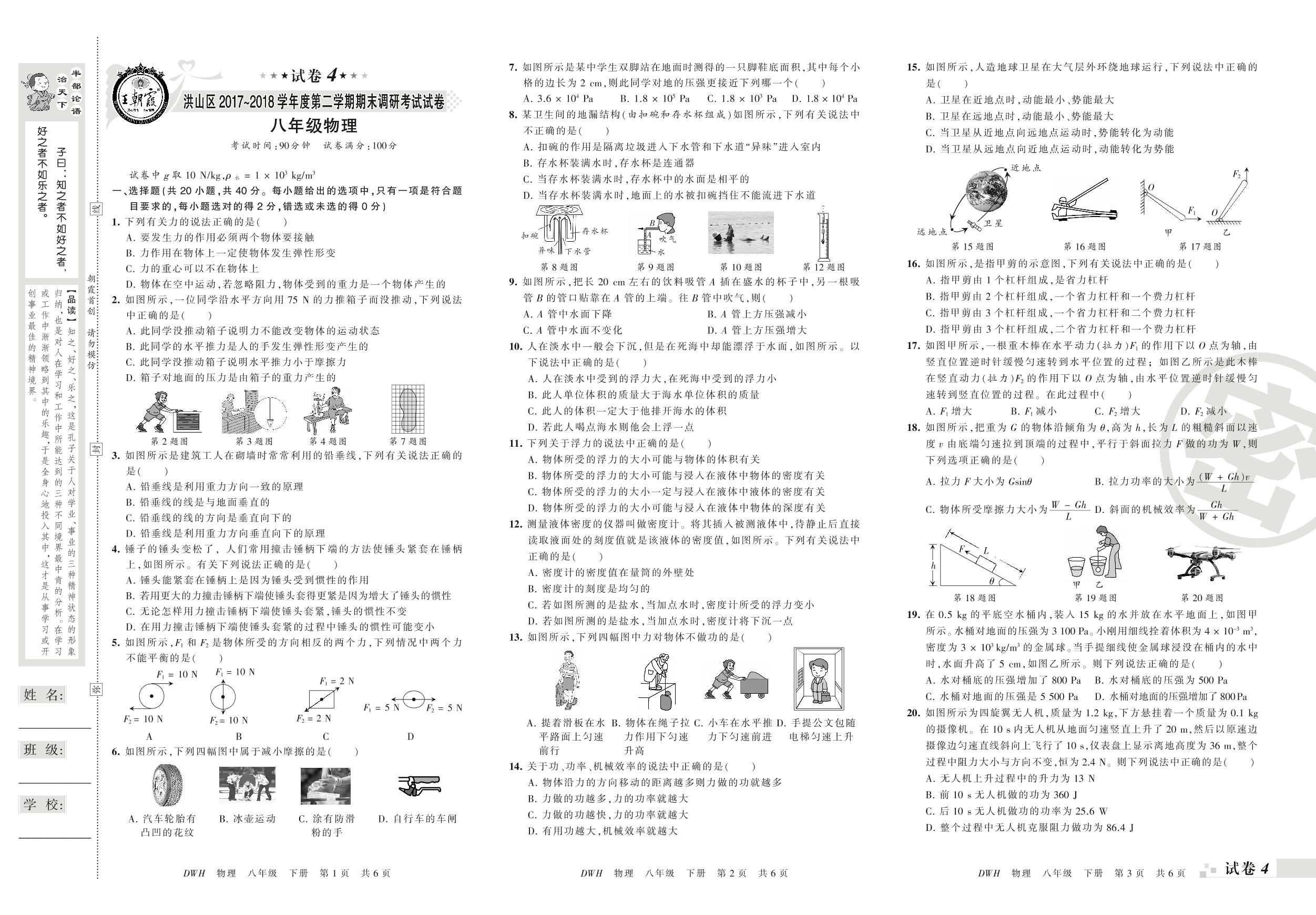 2017-2018学年第二学期武汉市洪山区八年级物理试卷(人教版)【4】