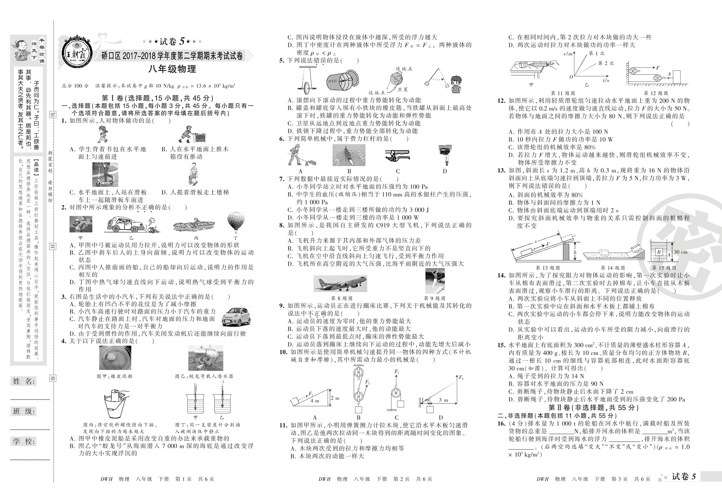 2017-2018学年第二学期硚口区八年级物理试卷(人教版)【5】