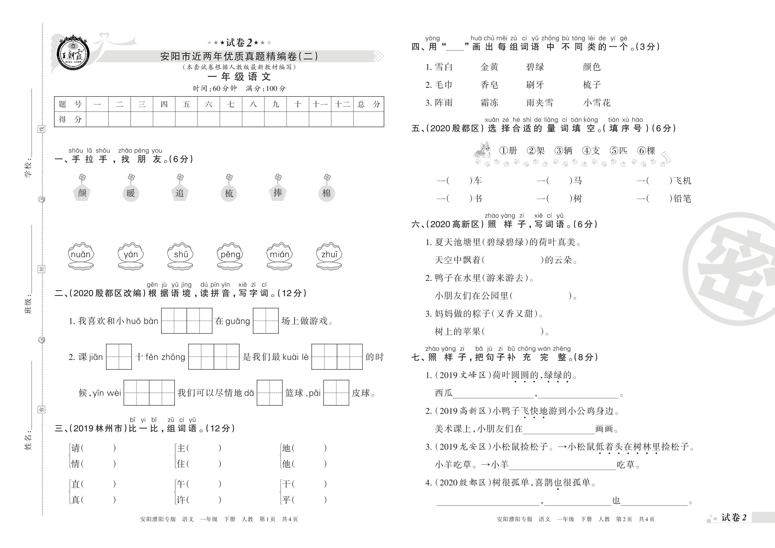 安阳市近两年优质真题精编卷(二)一年级下册语文(人教版)【2】