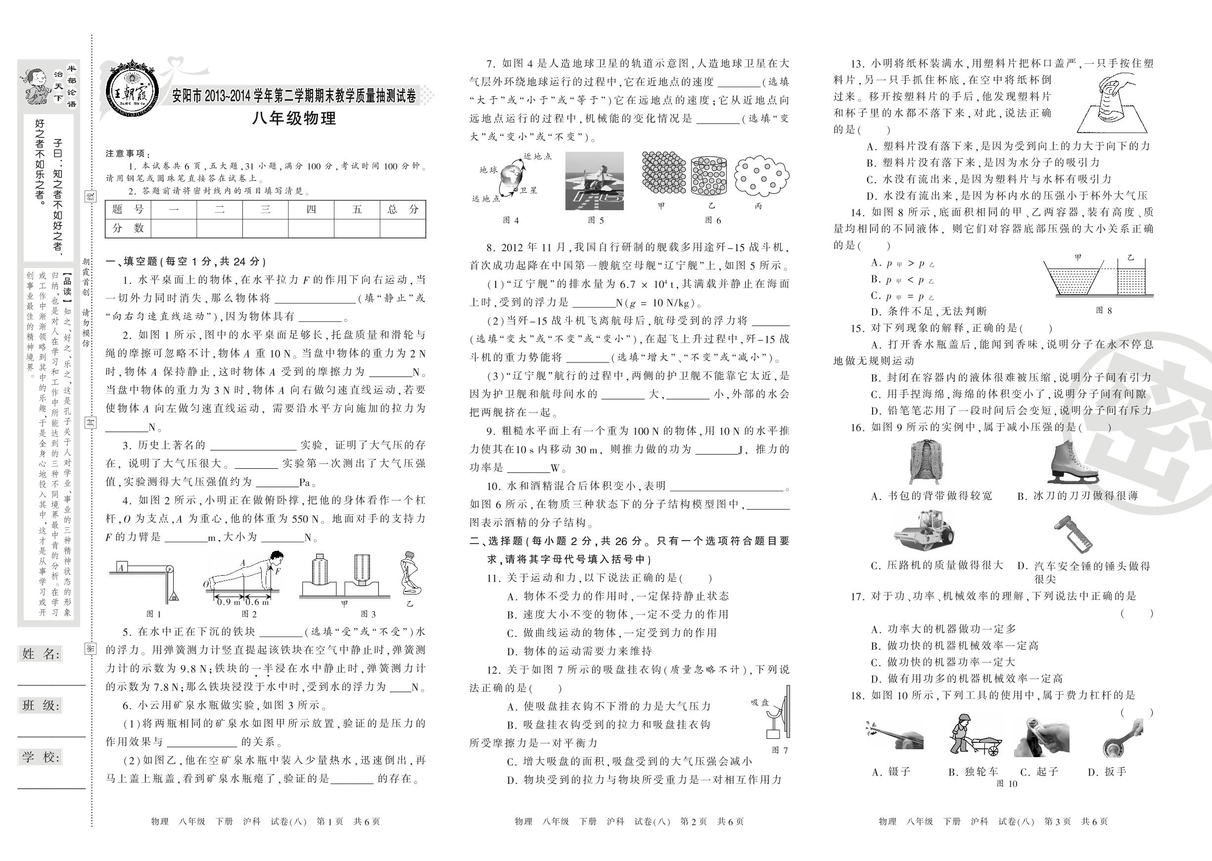 2013-2014学年第二学期安阳市八年级物理试卷(沪科版)【8】