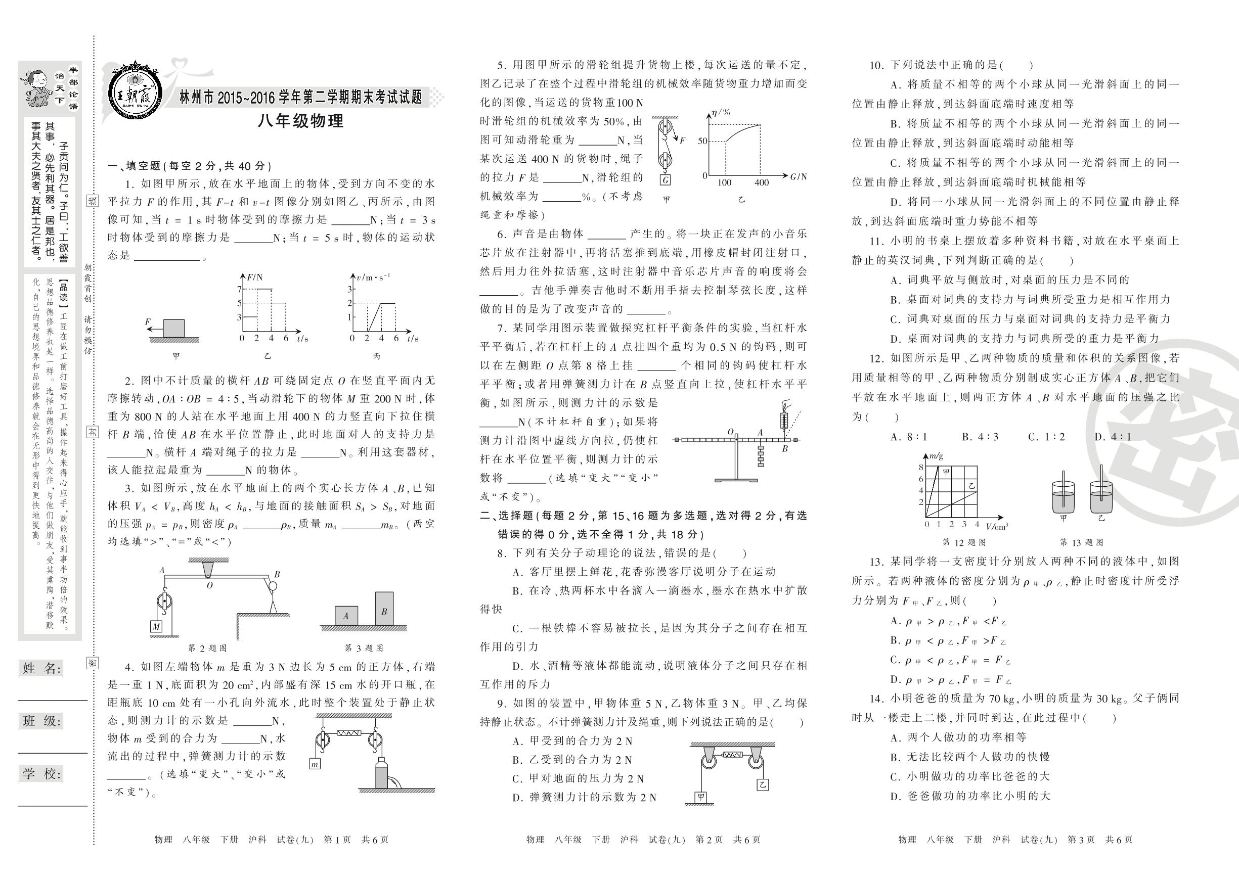2015-2016学年第二学期林州市八年级物理试卷(沪科版)【9】