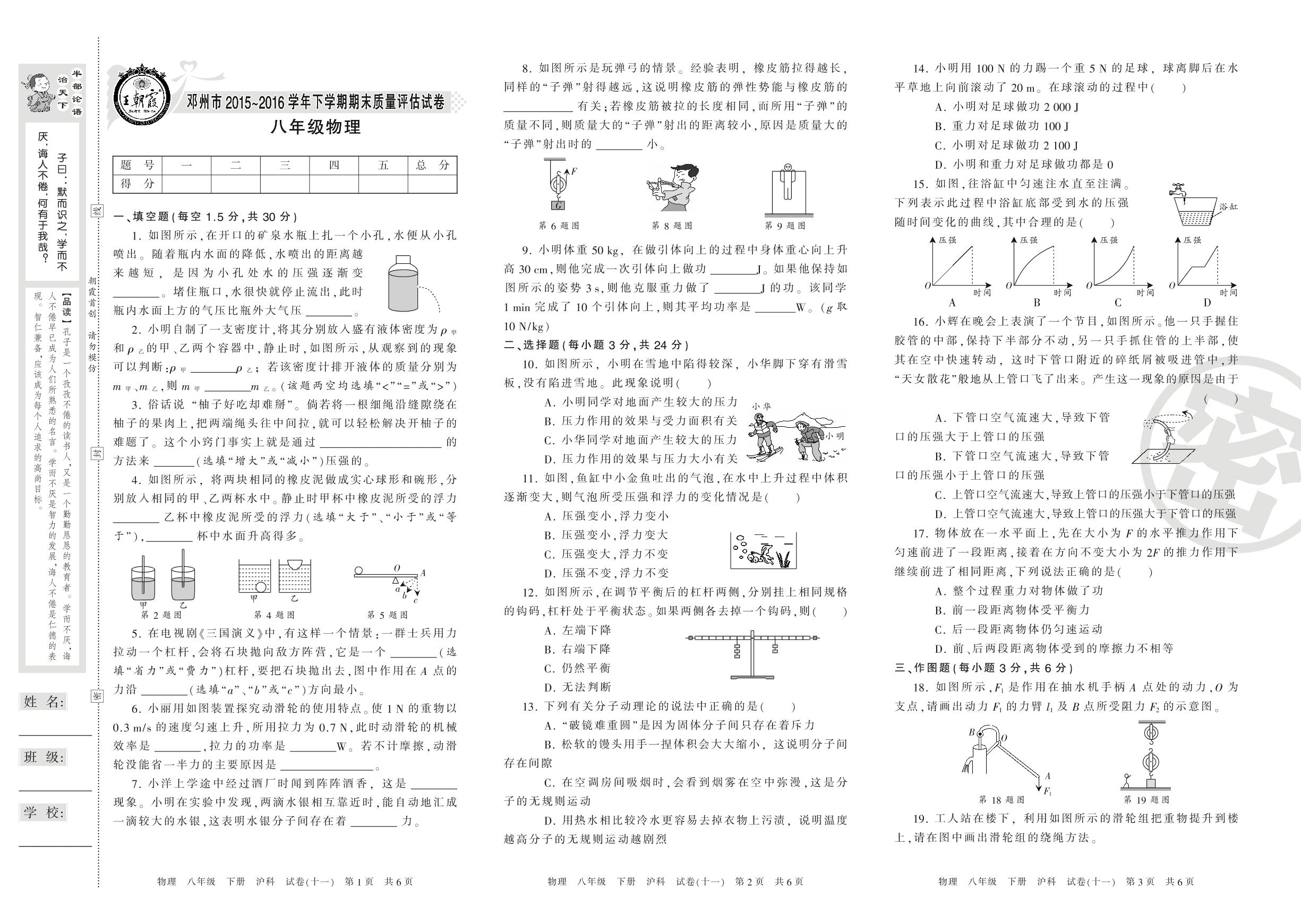 2015-2016学年第二学期邓州市八年级物理试卷(沪科版)【11】