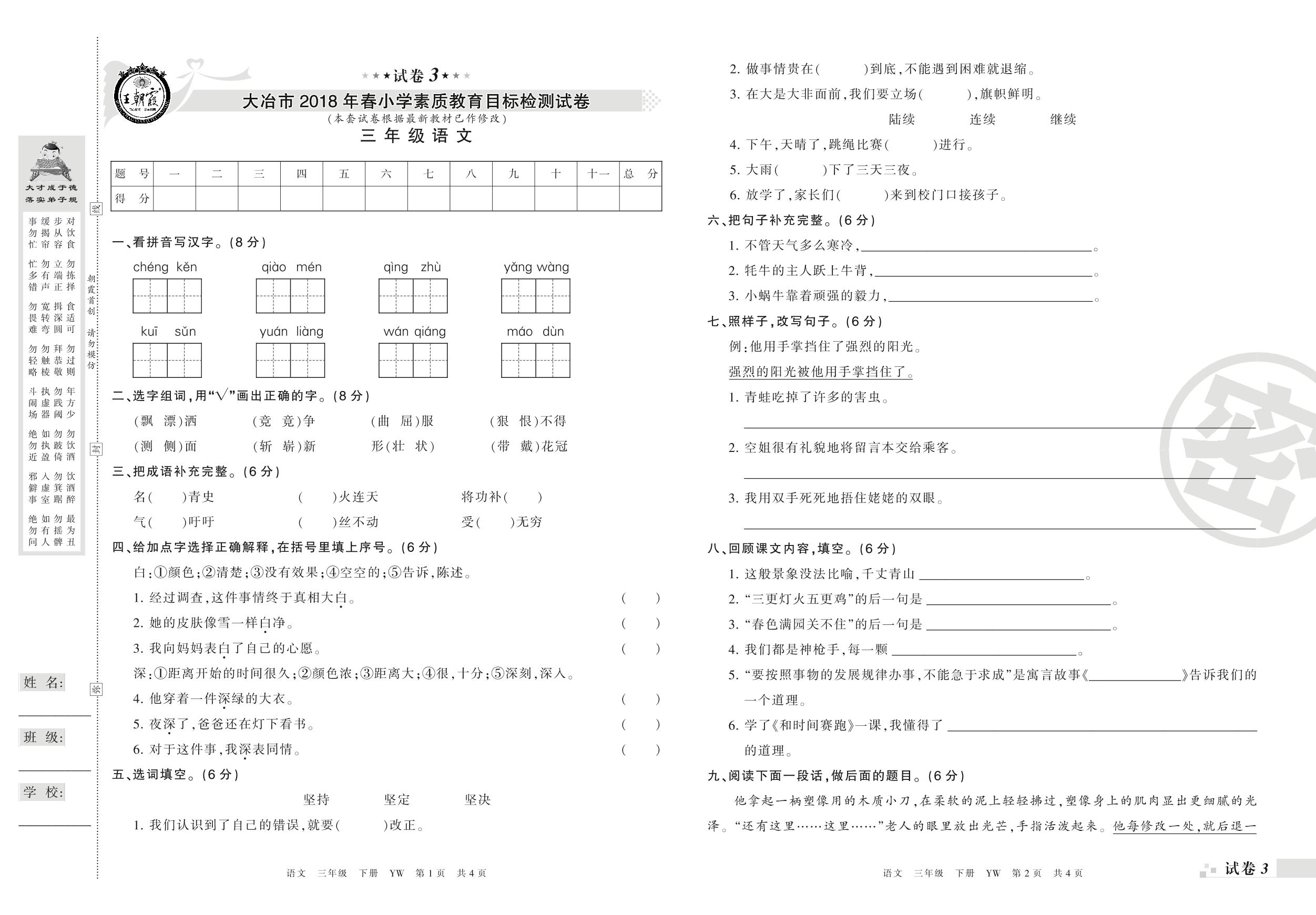 2017-2018学年第二学期大冶市三年级语文试卷(语文版)【3】