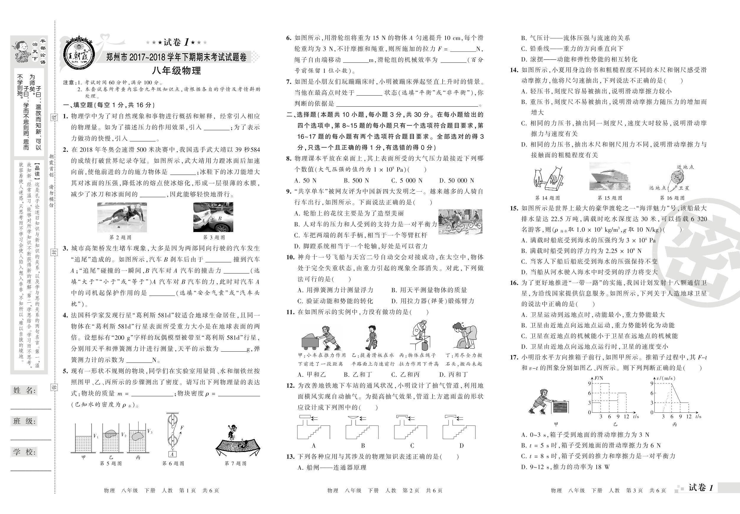 2017-2018学年第二学期郑州市八年级物理试卷(人教版)_R210810180620【1】