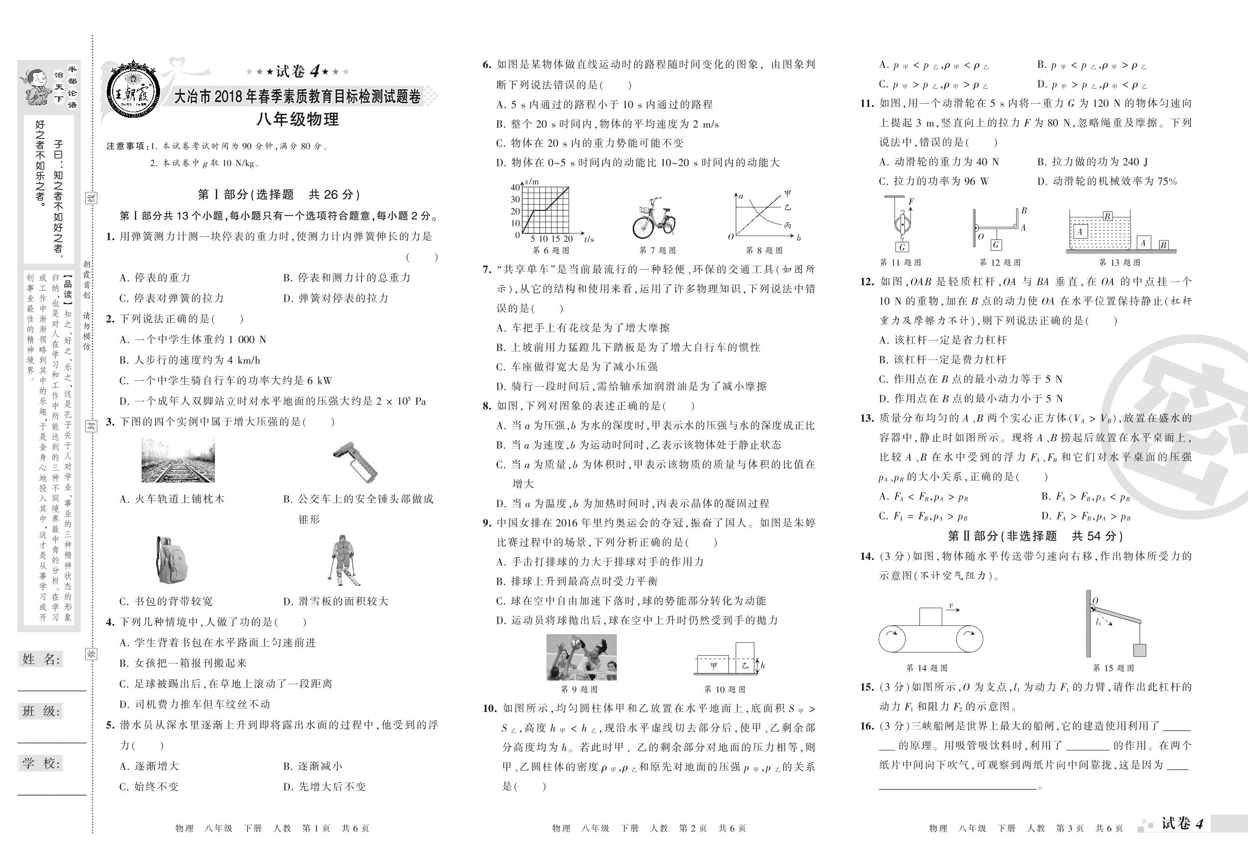 2017-2018学年第二学期大冶市八年级物理试卷(人教版)【4】