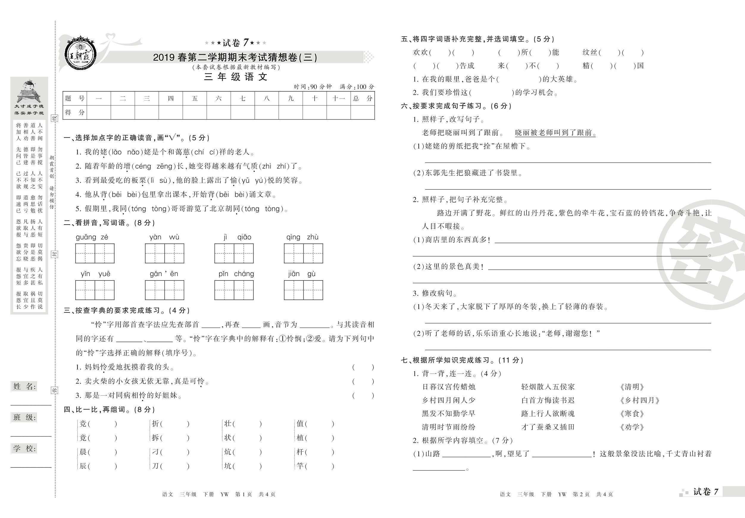 王朝霞期末猜想卷三年级下册语文(语文版)【7】