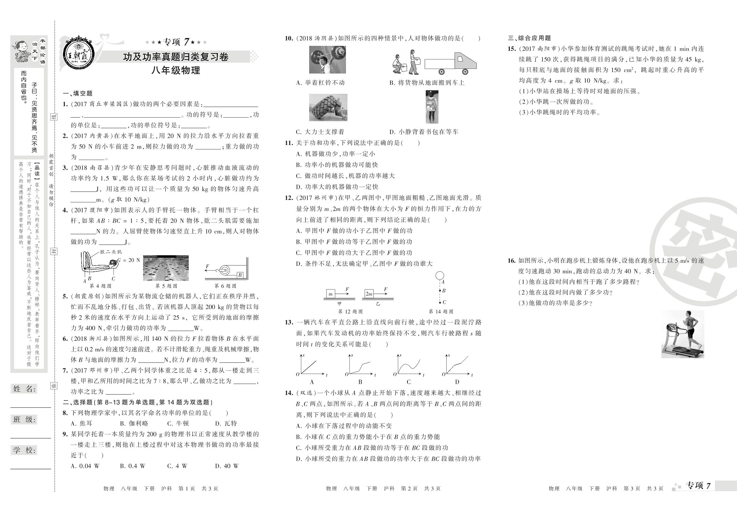 王朝霞期末专项卷——功及功率真题归类复习、机械效率及机械能真题归类复习八年级下册物理(沪科版)【0】
