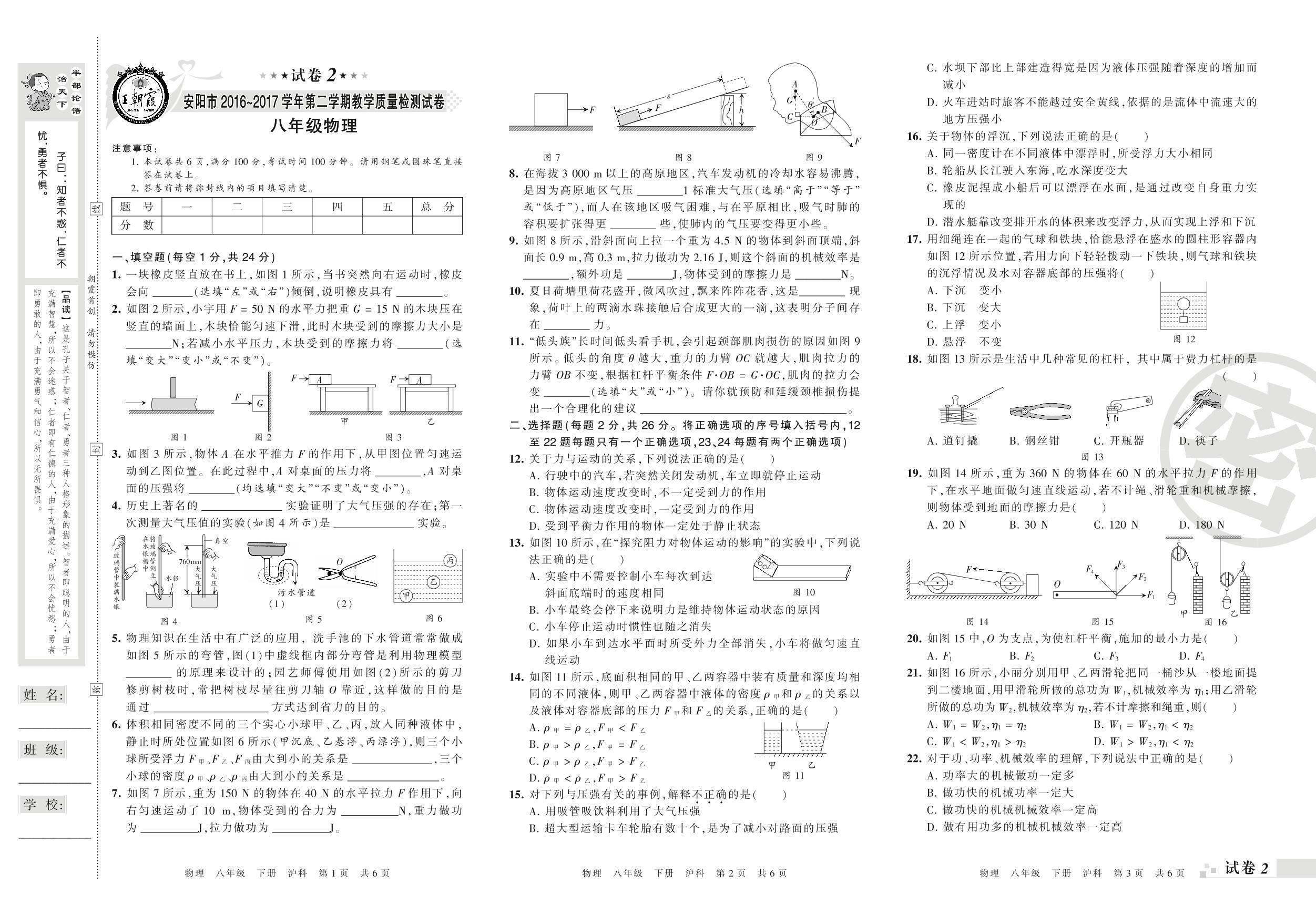 2016-2017学年第二学期安阳市八年级物理试卷(沪科版)【2】