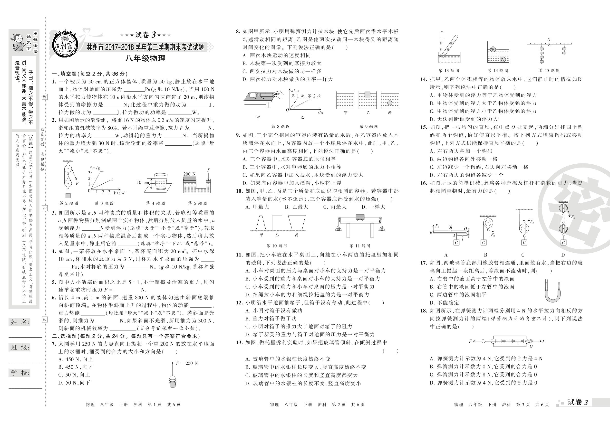 2017-2018学年第二学期林州市八年级物理试卷(沪科版)【3】