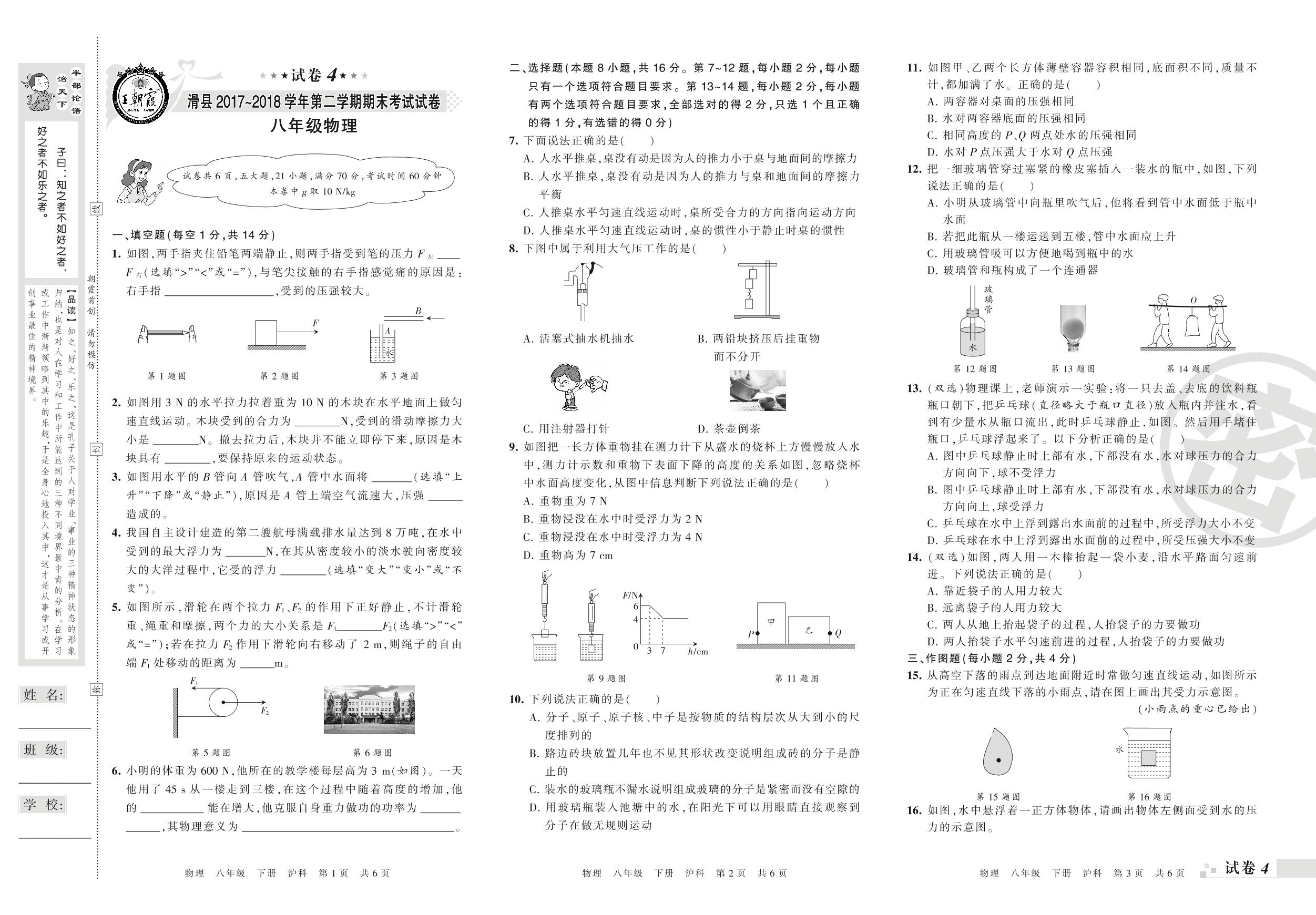 2017-2018学年第二学期安阳市滑县八年级物理试卷(沪科版)【4】