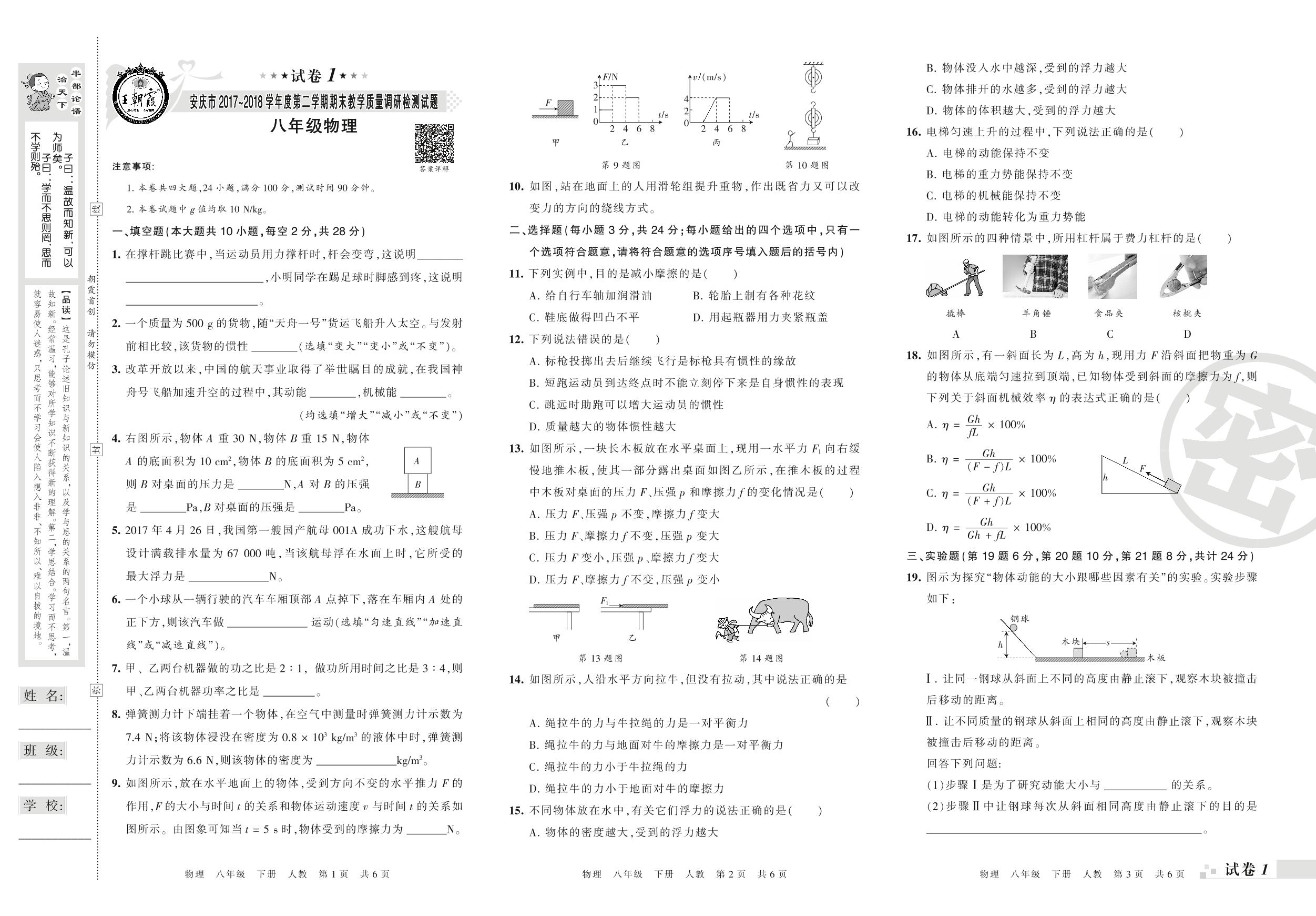 2017-2018学年第二学期安庆市八年级物理试卷(人教版)【1】