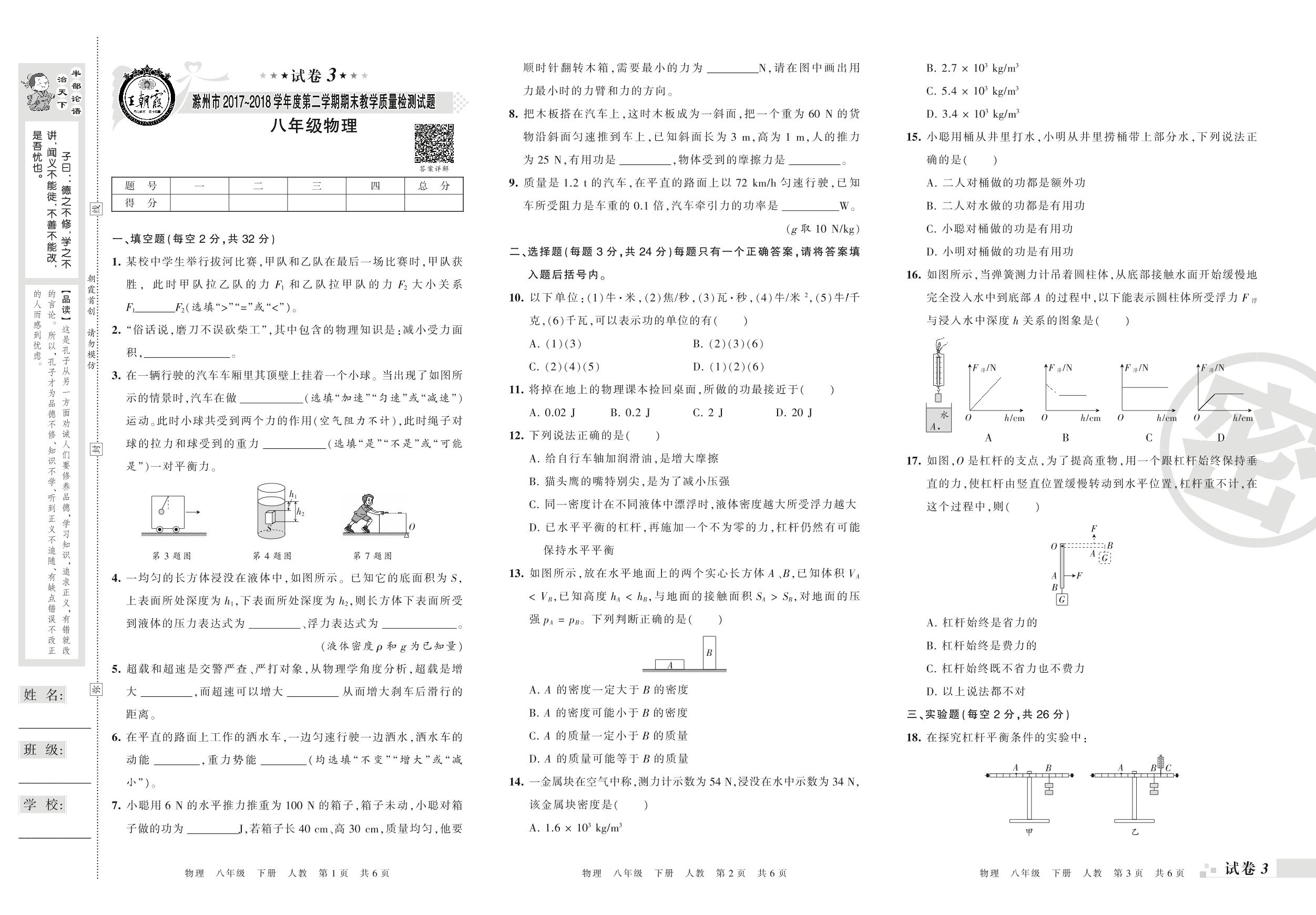 2017-2018学年第二学期滁州市八年级物理试卷(人教版)【3】