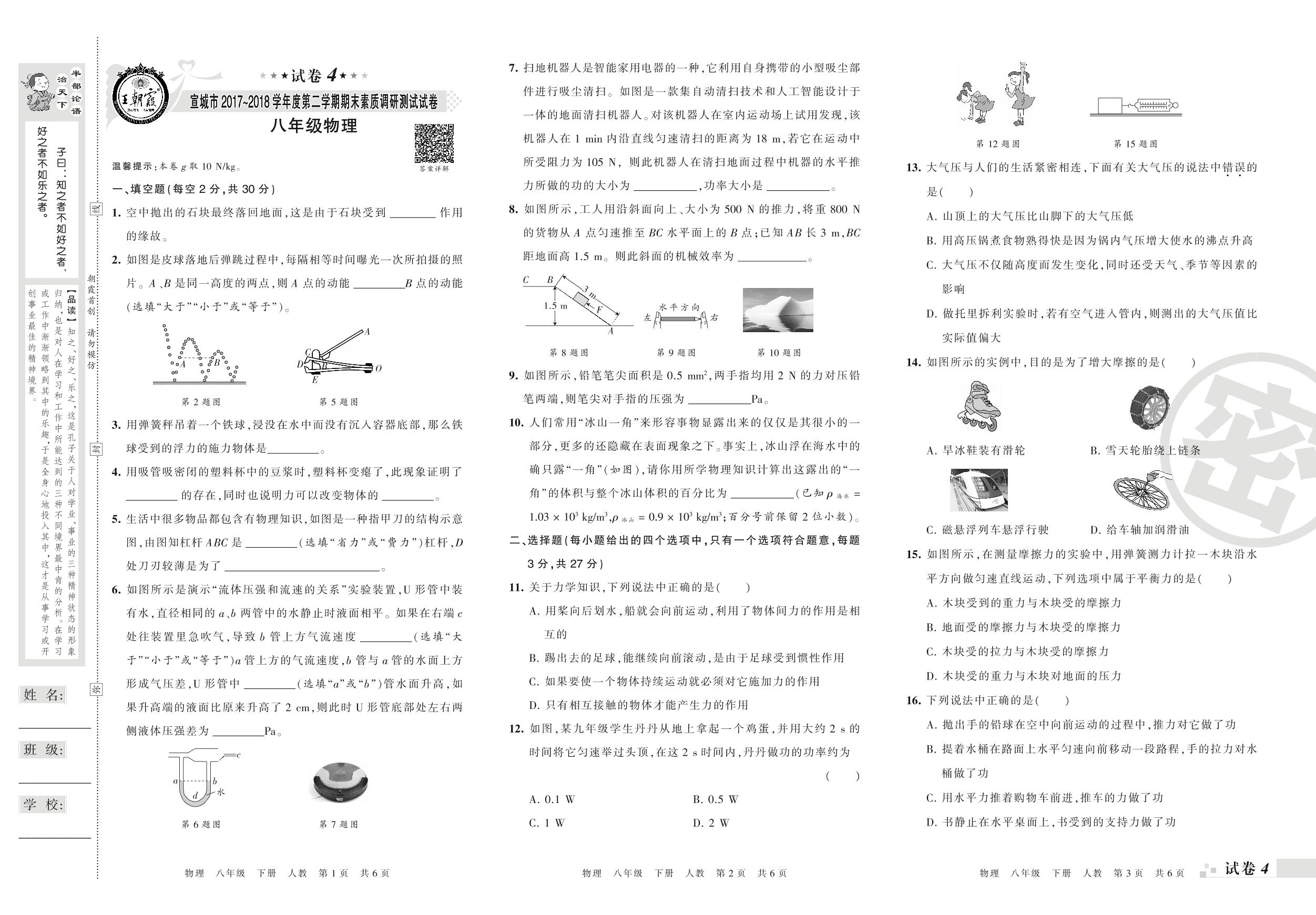 2017-2018学年第二学期宣城市八年级物理试卷(人教版)【4】