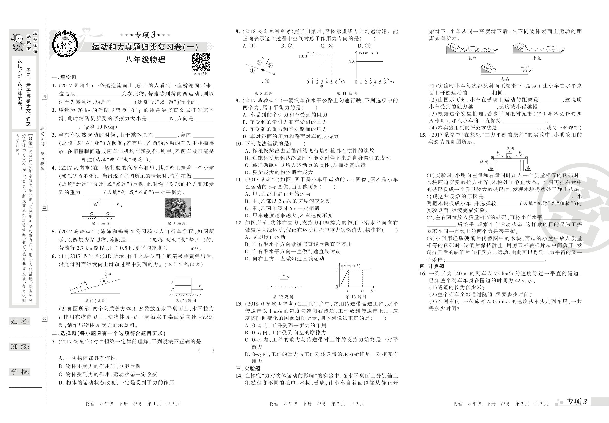 王朝霞期末专项卷——运动和力真题归类复习(一)、运动和力真题归类复习(二)八年级下册物理(沪粤版)【0】