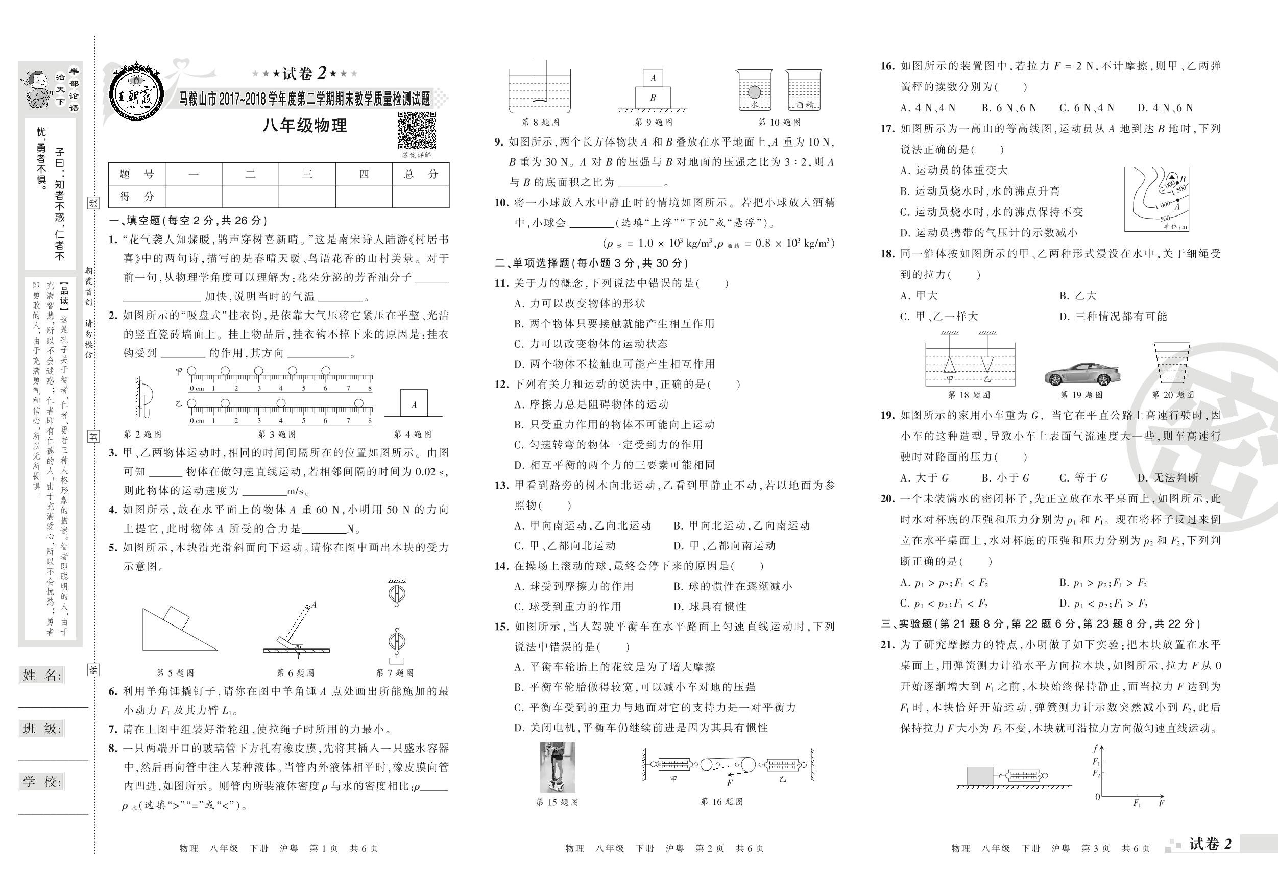2017-2018学年第二学期马鞍山市八年级物理试卷(沪粤版)【2】