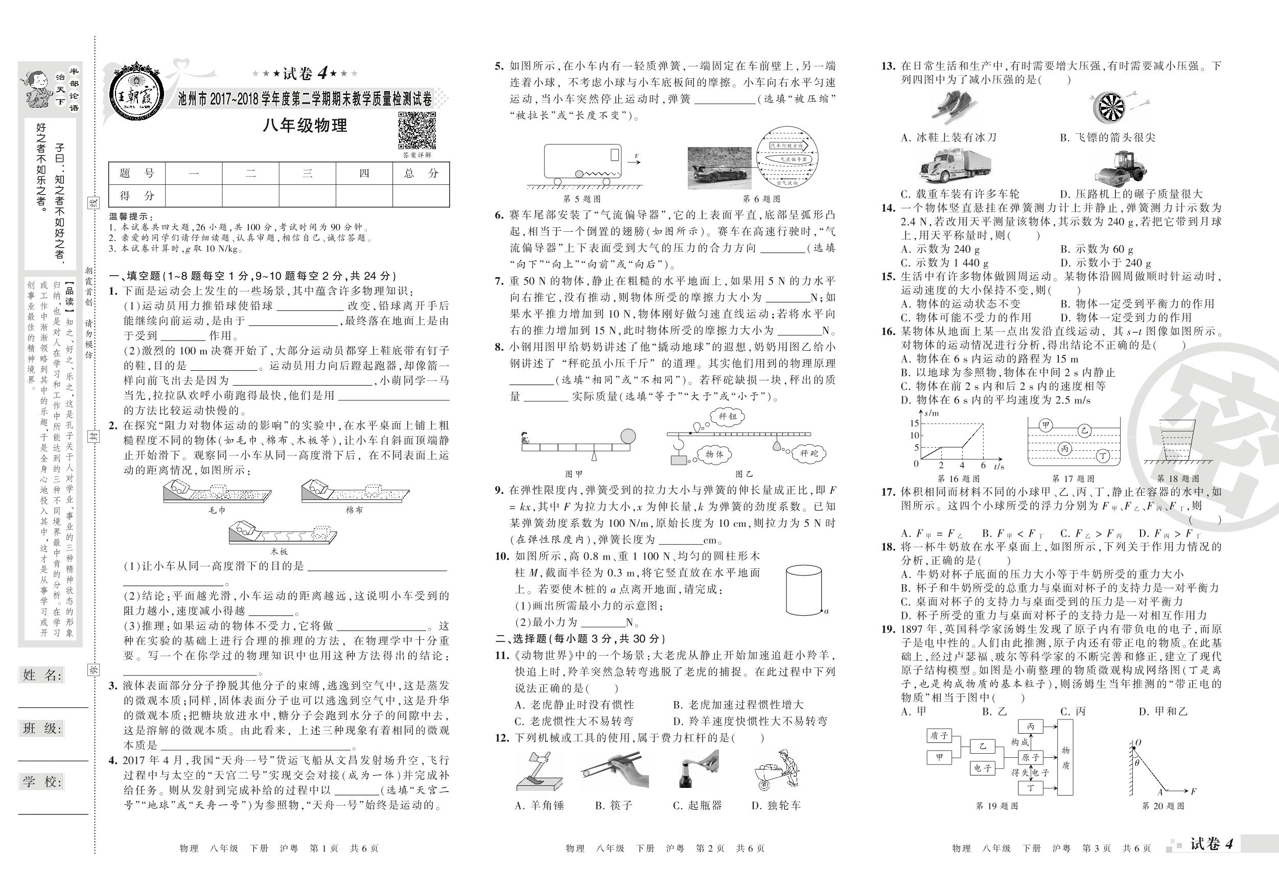 2017-2018学年第二学期池州市八年级物理试卷(沪粤版)【4】