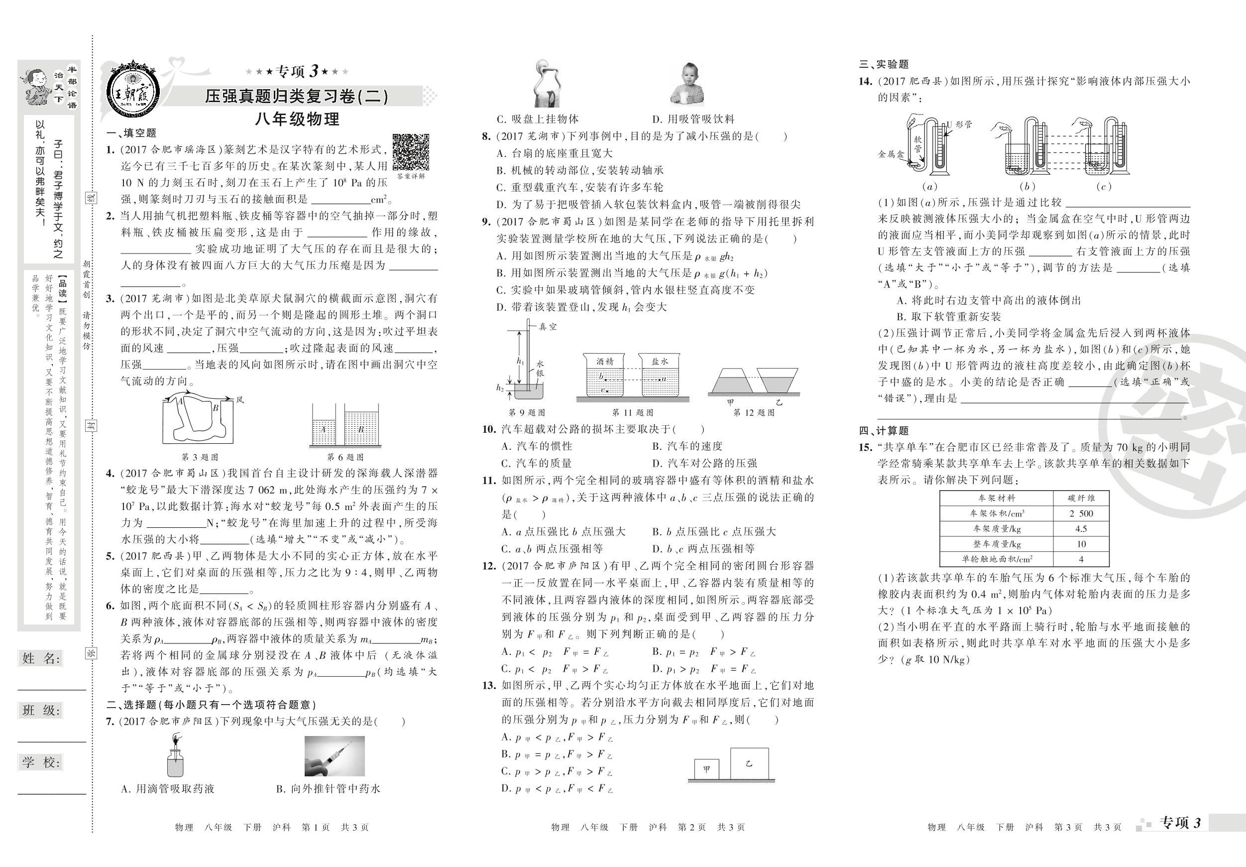 八年级物理沪科版下册专项卷