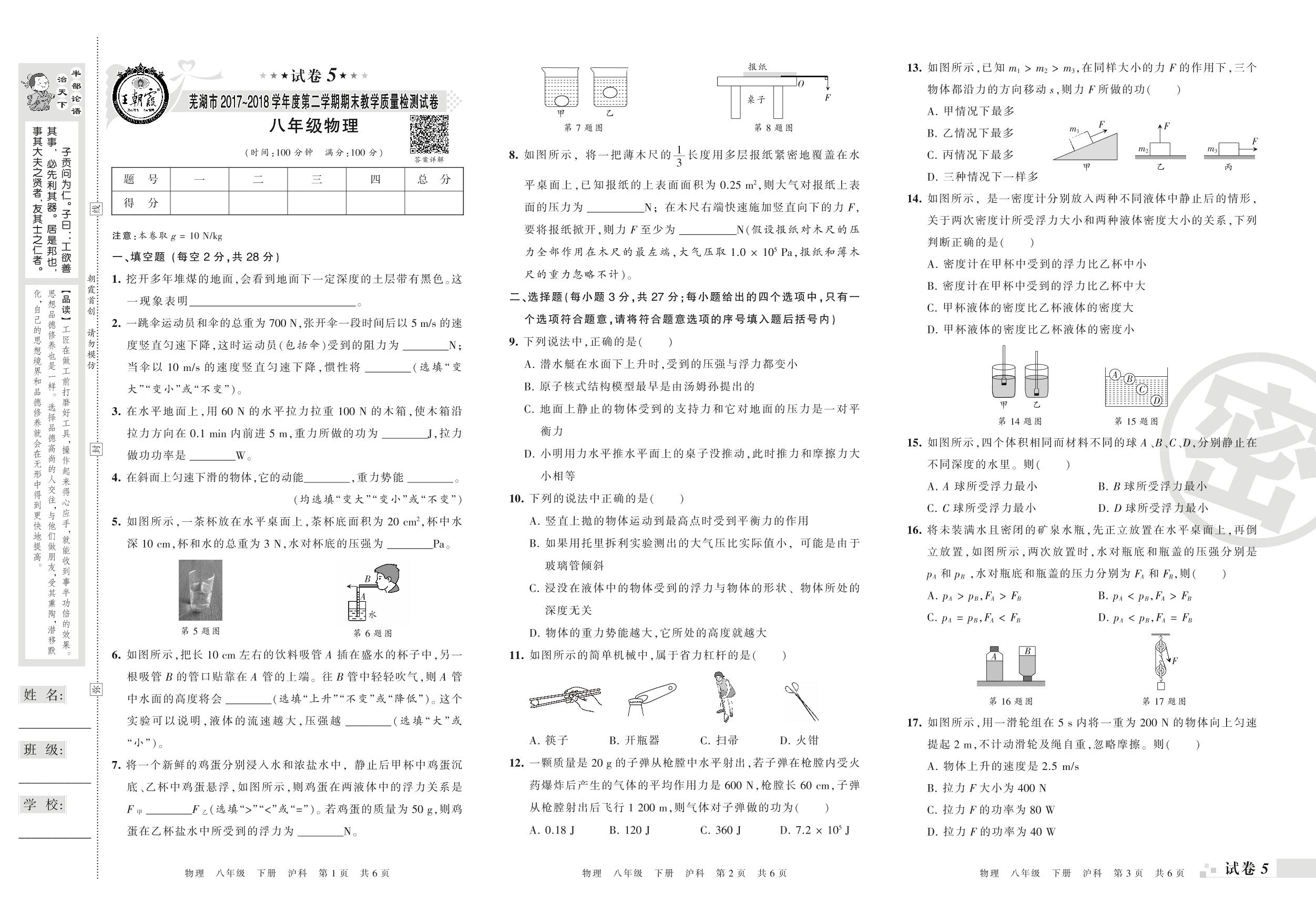 2017-2018学年第二学期芜湖市八年级物理试卷(沪科版)【5】