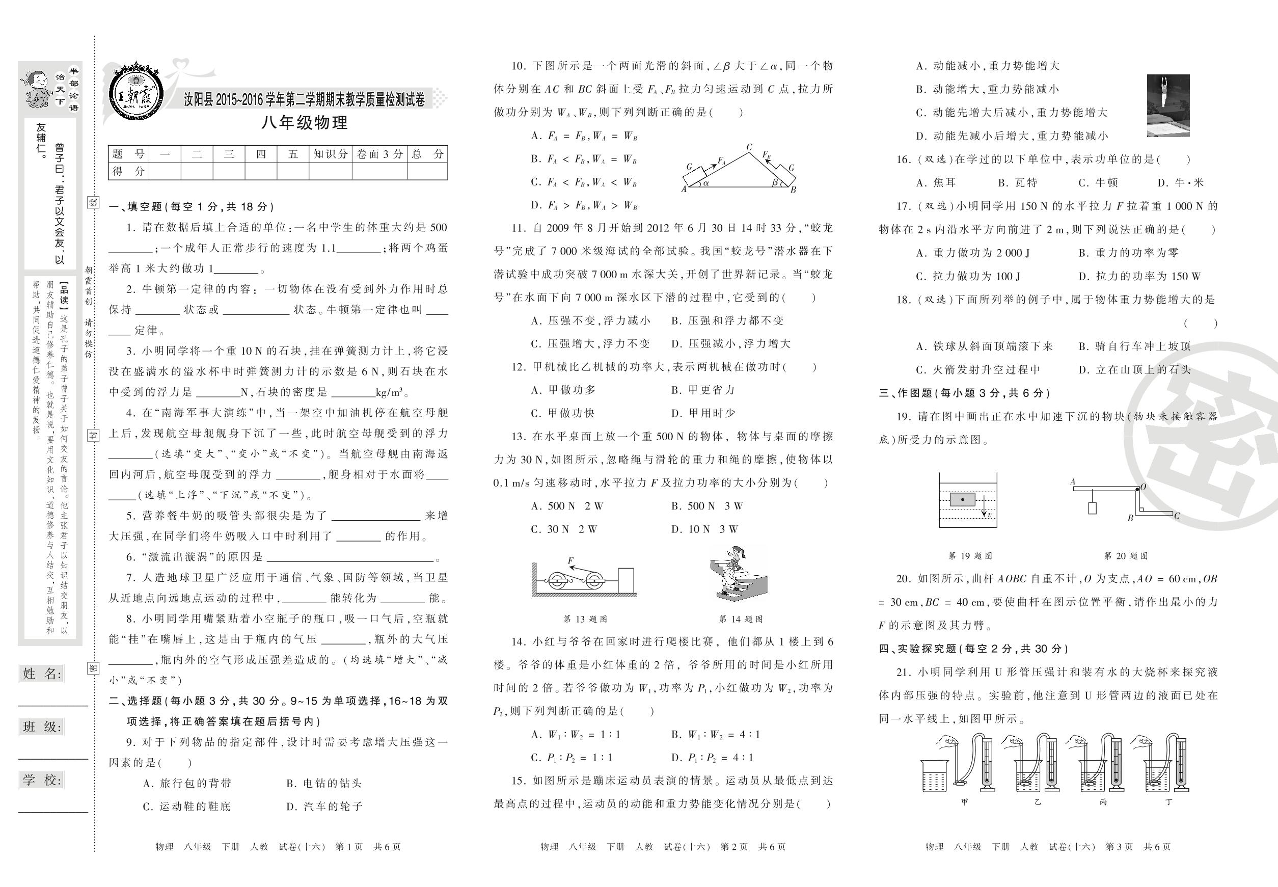 2015-2016学年第二学期洛阳市汝阳县八年级物理试卷(人教版)【16】