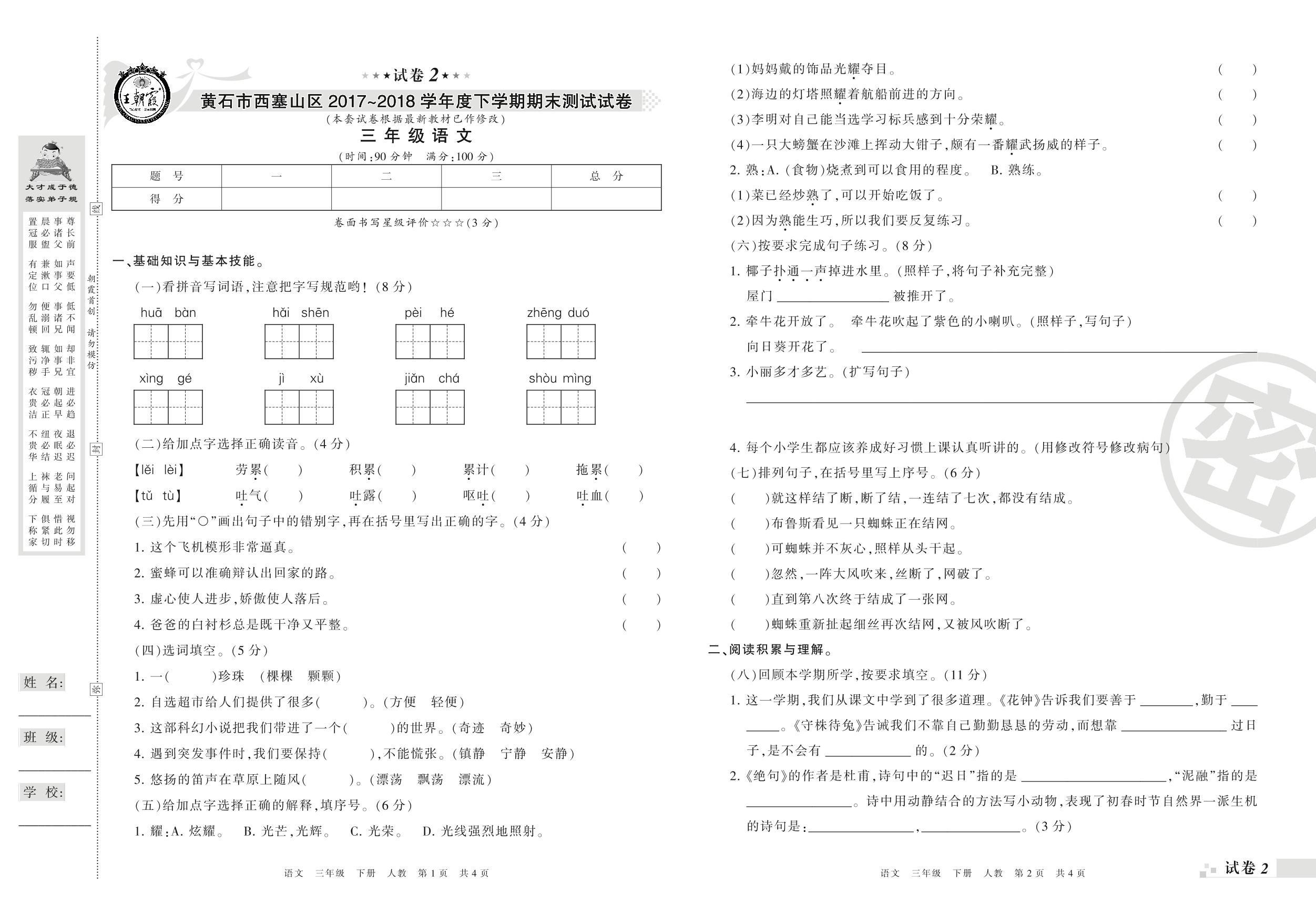 2017-2018学年第二学期黄石市西塞山区三年级语文试卷(人教版)【2】