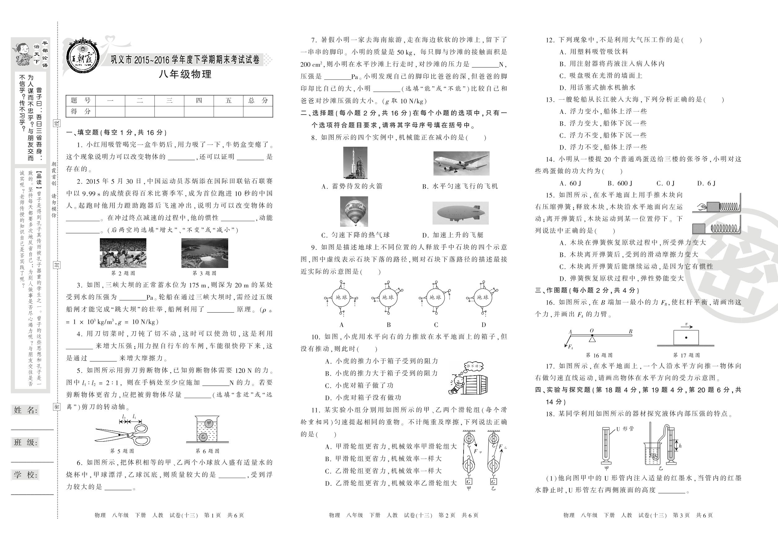 2015-2016学年第二学期巩义市八年级物理试卷(人教版)【13】