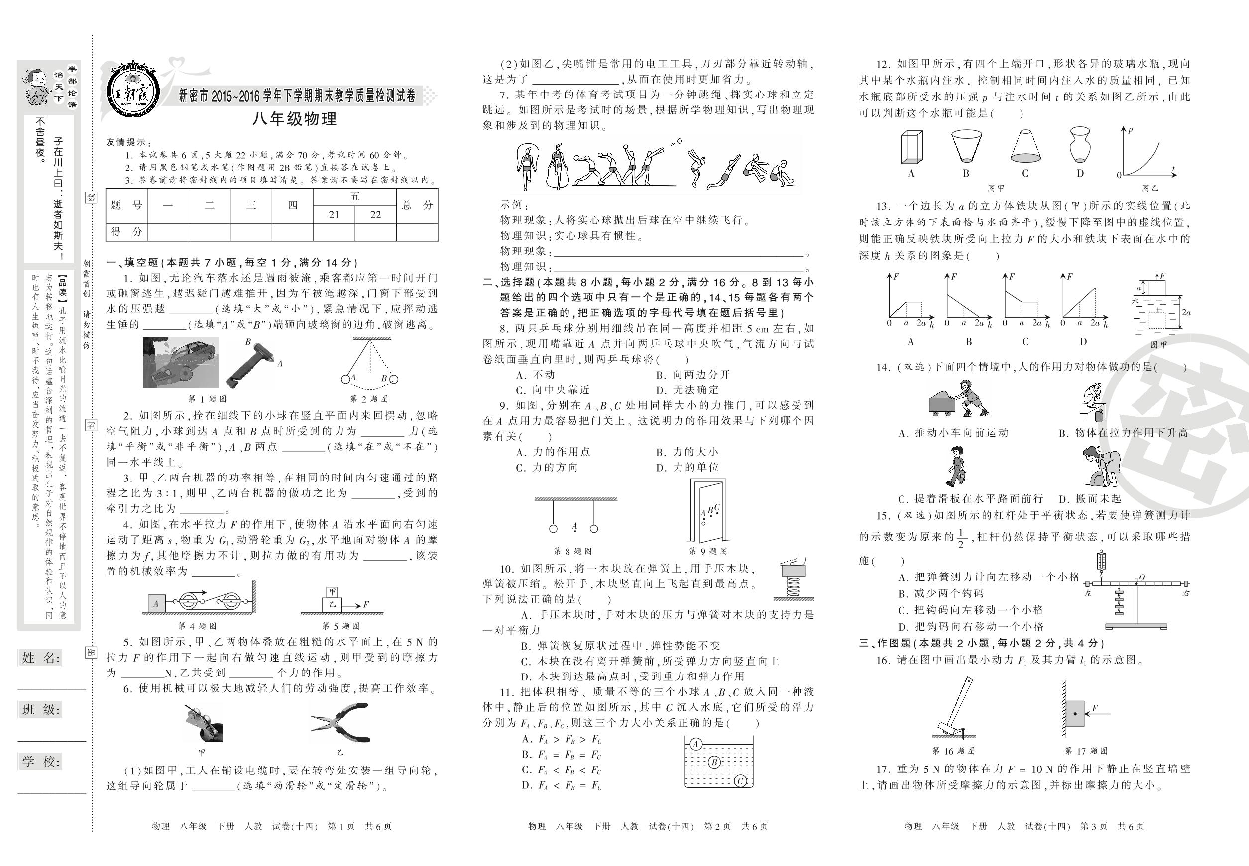 2015-2016学年第二学期新密市八年级物理试卷(人教版)【14】