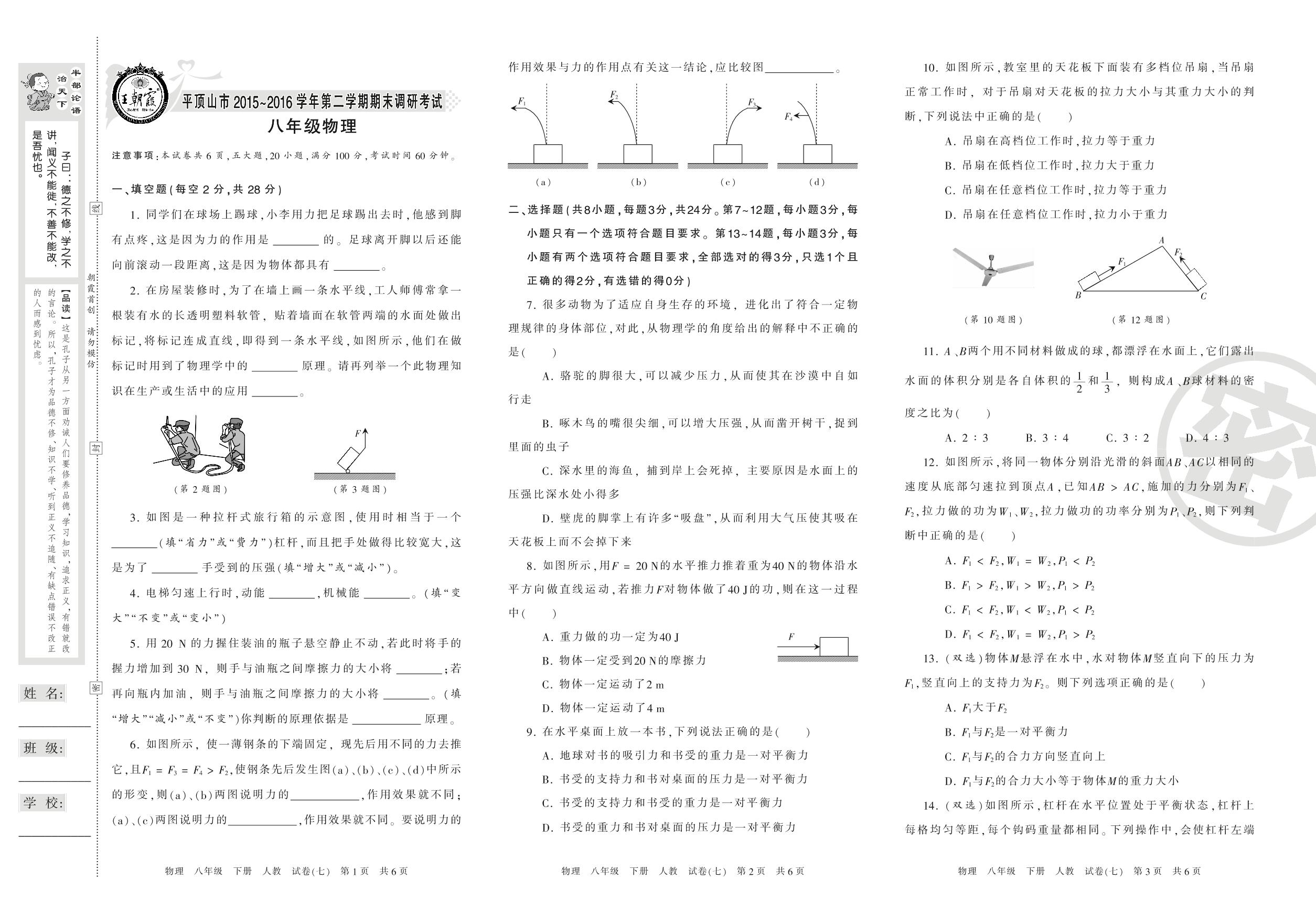 2015-2016学年第二学期平顶山市八年级物理试卷(人教版)【7】