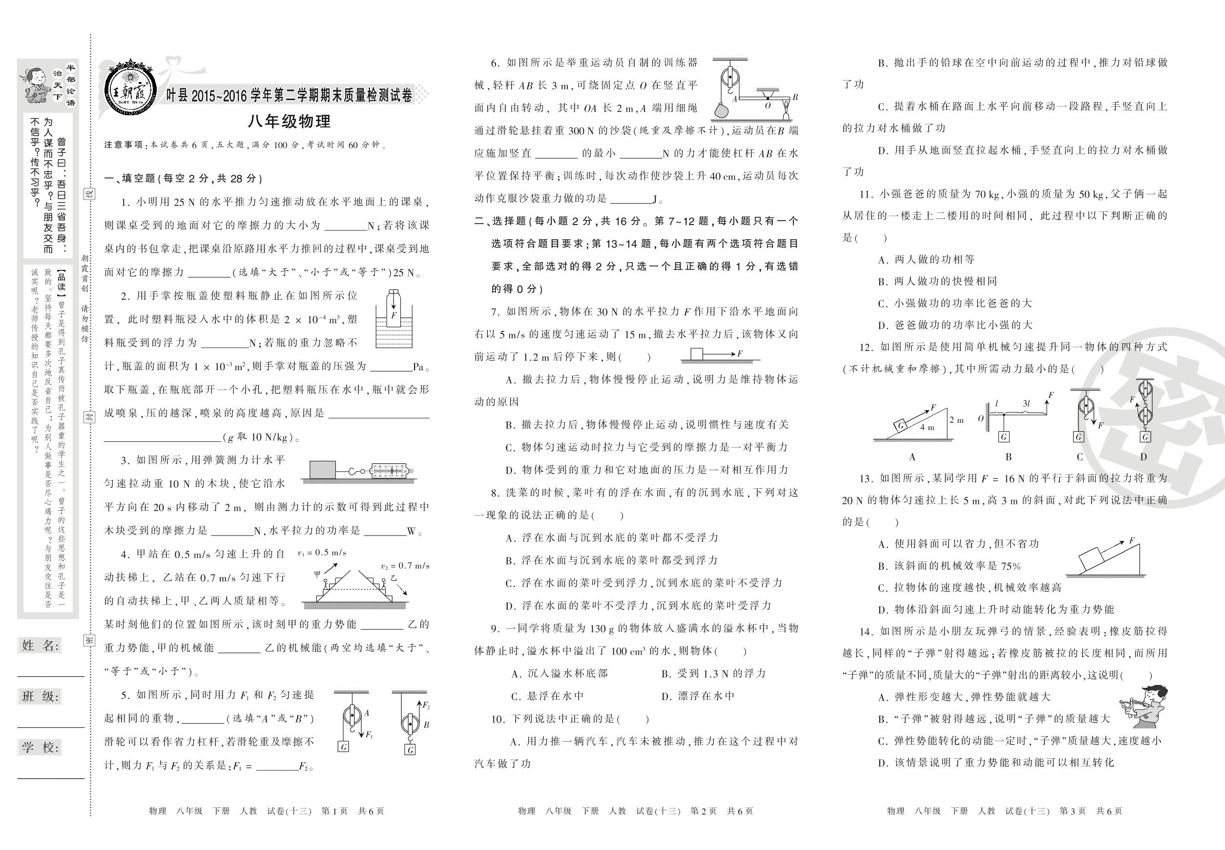 2015-2016学年第二学期平顶山市叶县八年级物理试卷(人教版)【13】