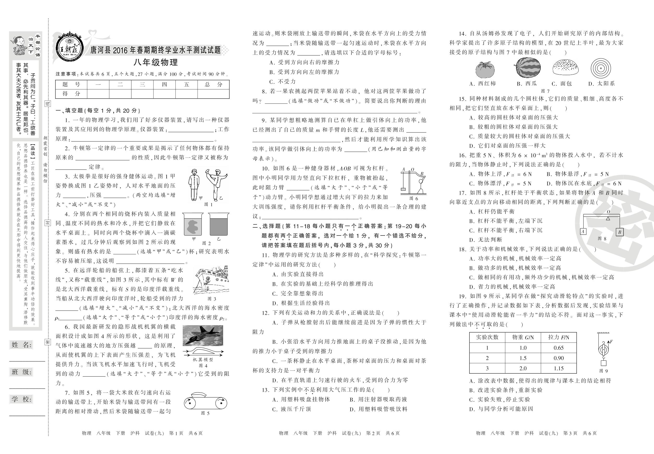2015-2016学年第二学期南阳市唐河县八年级物理试卷(沪科版)【9】