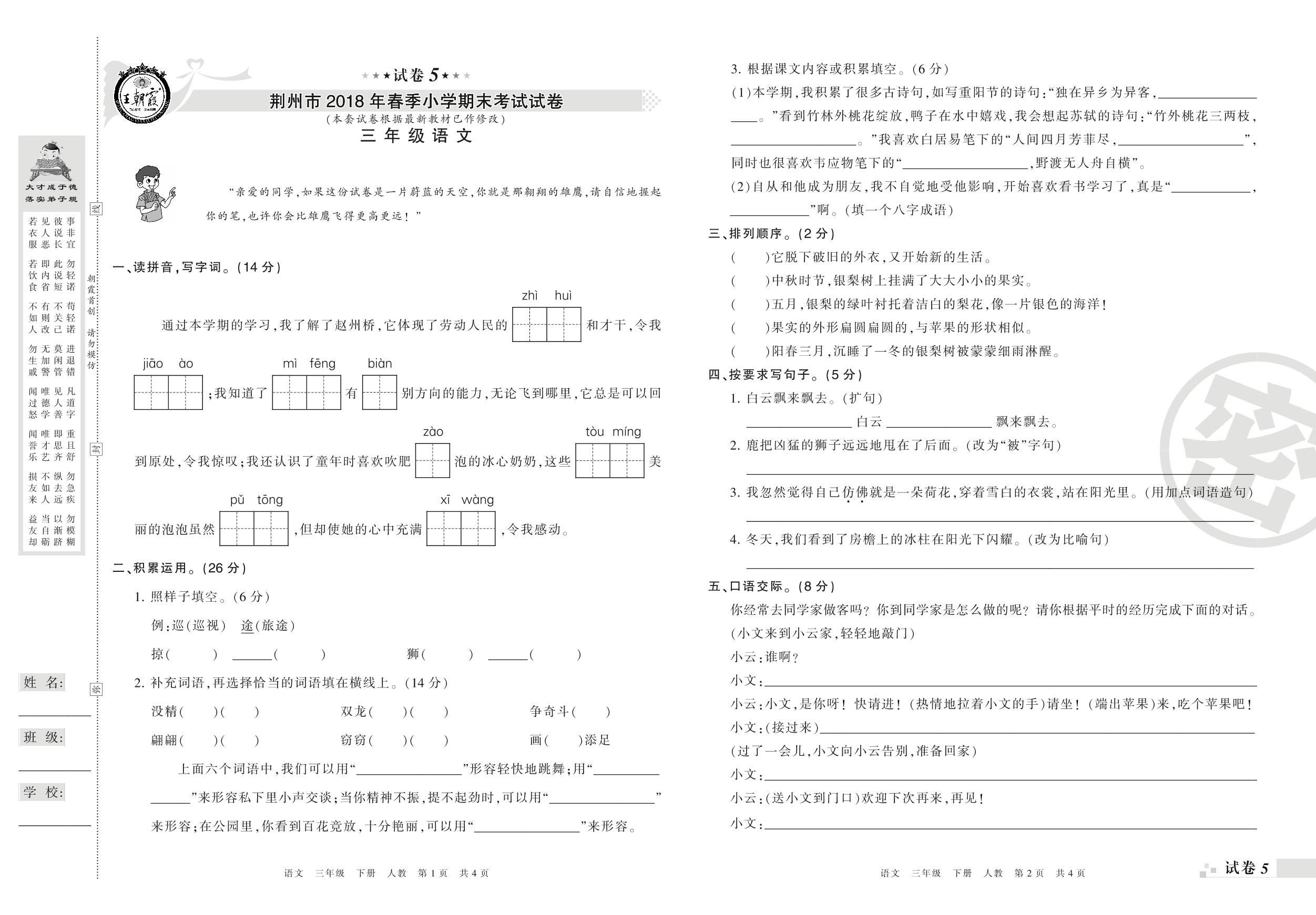 2017-2018学年第二学期荆州市三年级语文试卷(人教版)【5】
