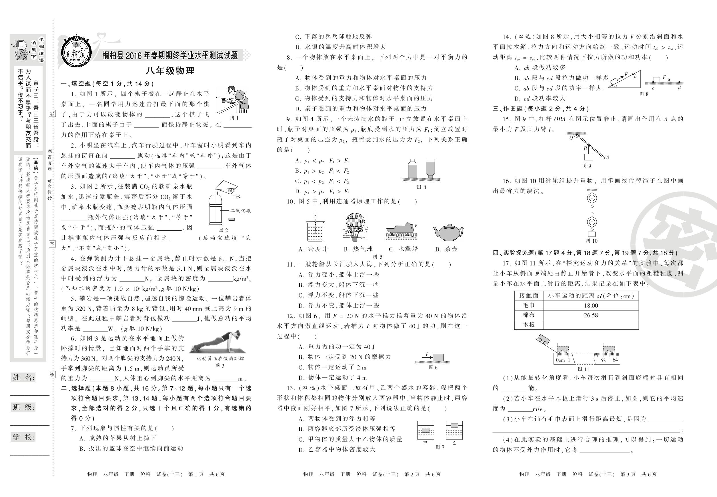 2015-2016学年第二学期南阳市桐柏县八年级物理试卷(沪科版)【13】