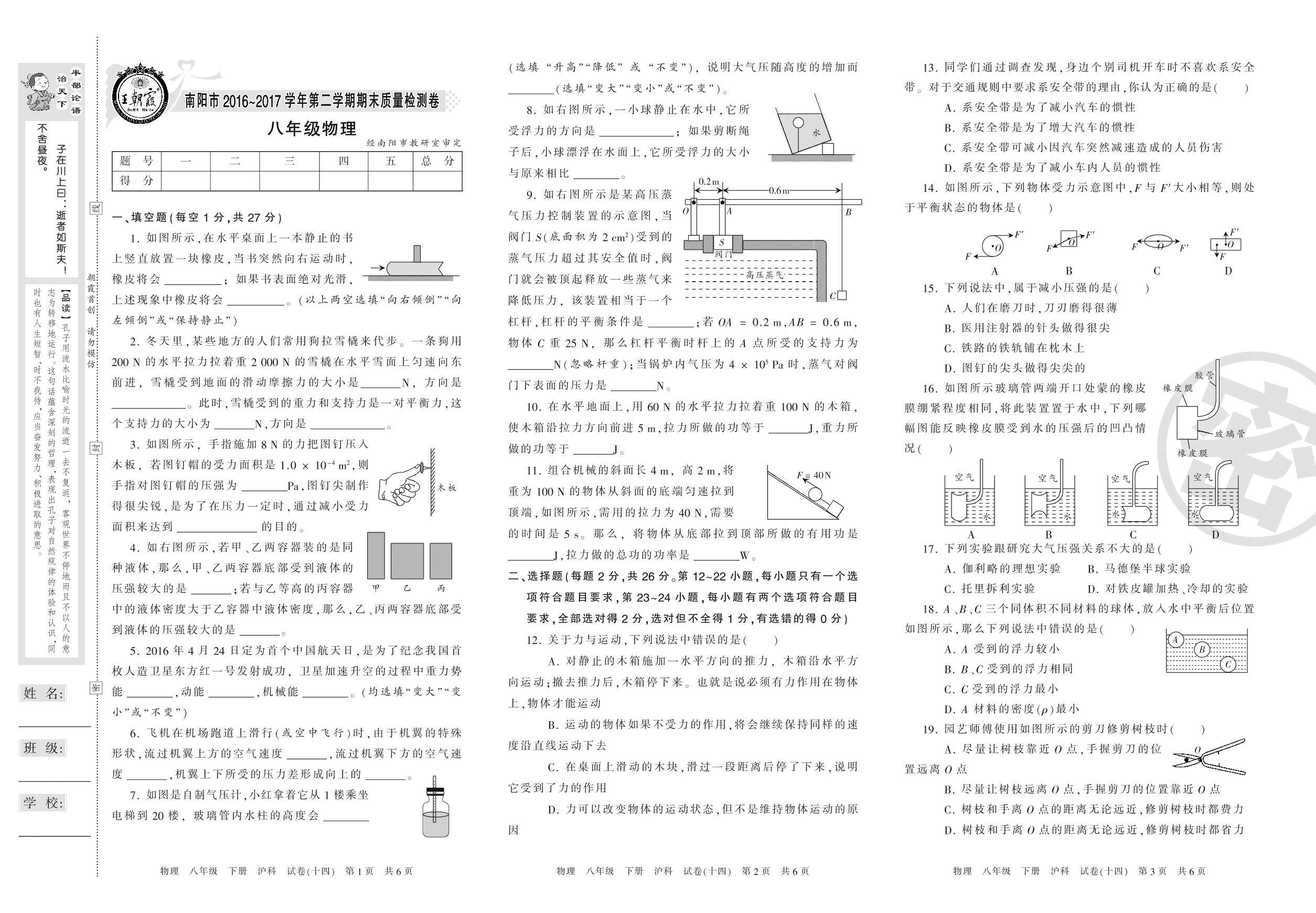 2016-2017学年第二学期南阳市八年级物理试卷(沪科版)【14】