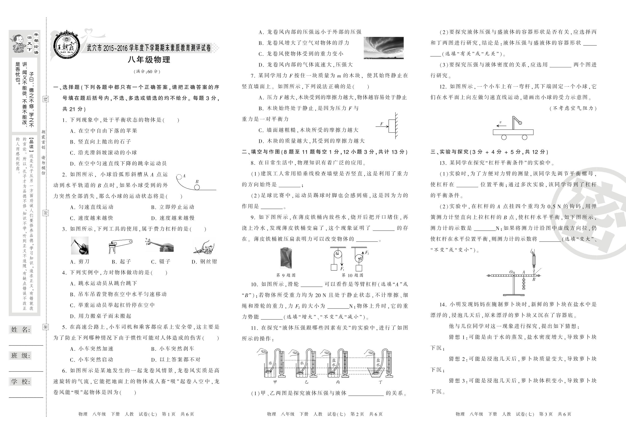 八年级物理人教版下册期末卷