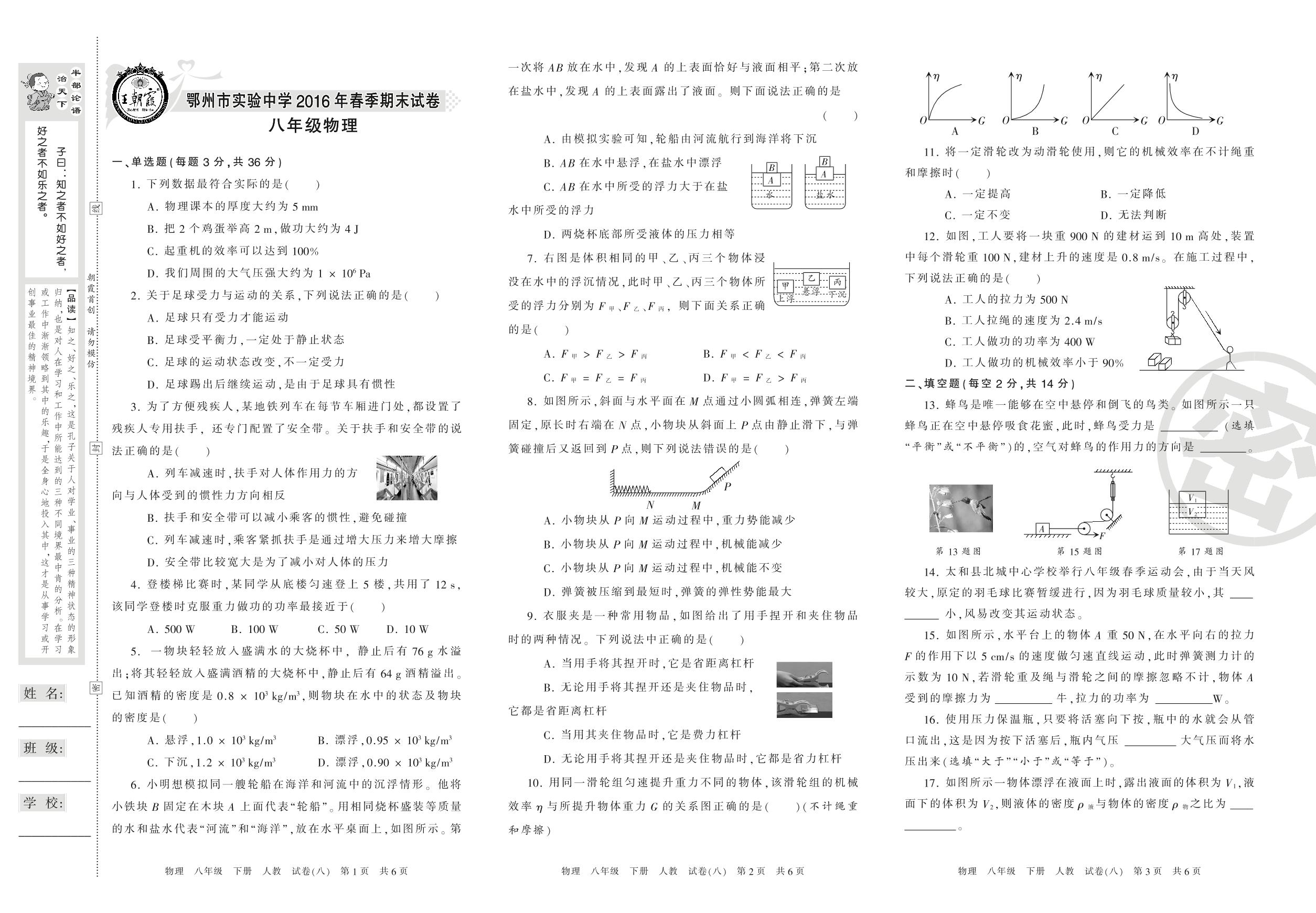 2015-2016学年第二学期鄂州市八年级物理试卷(人教版)【8】