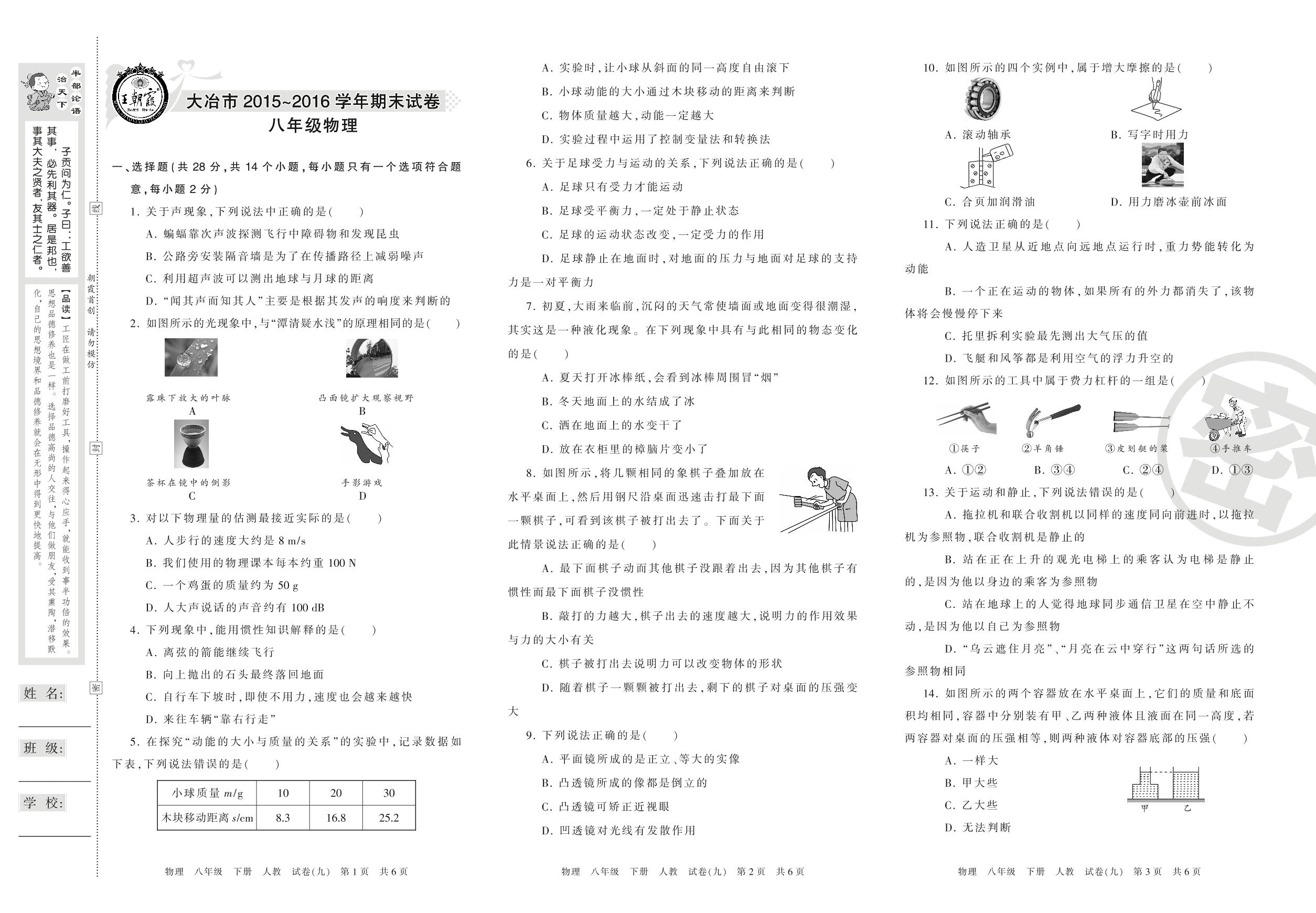 2015-2016学年第二学期大冶市八年级物理试卷(人教版)【9】