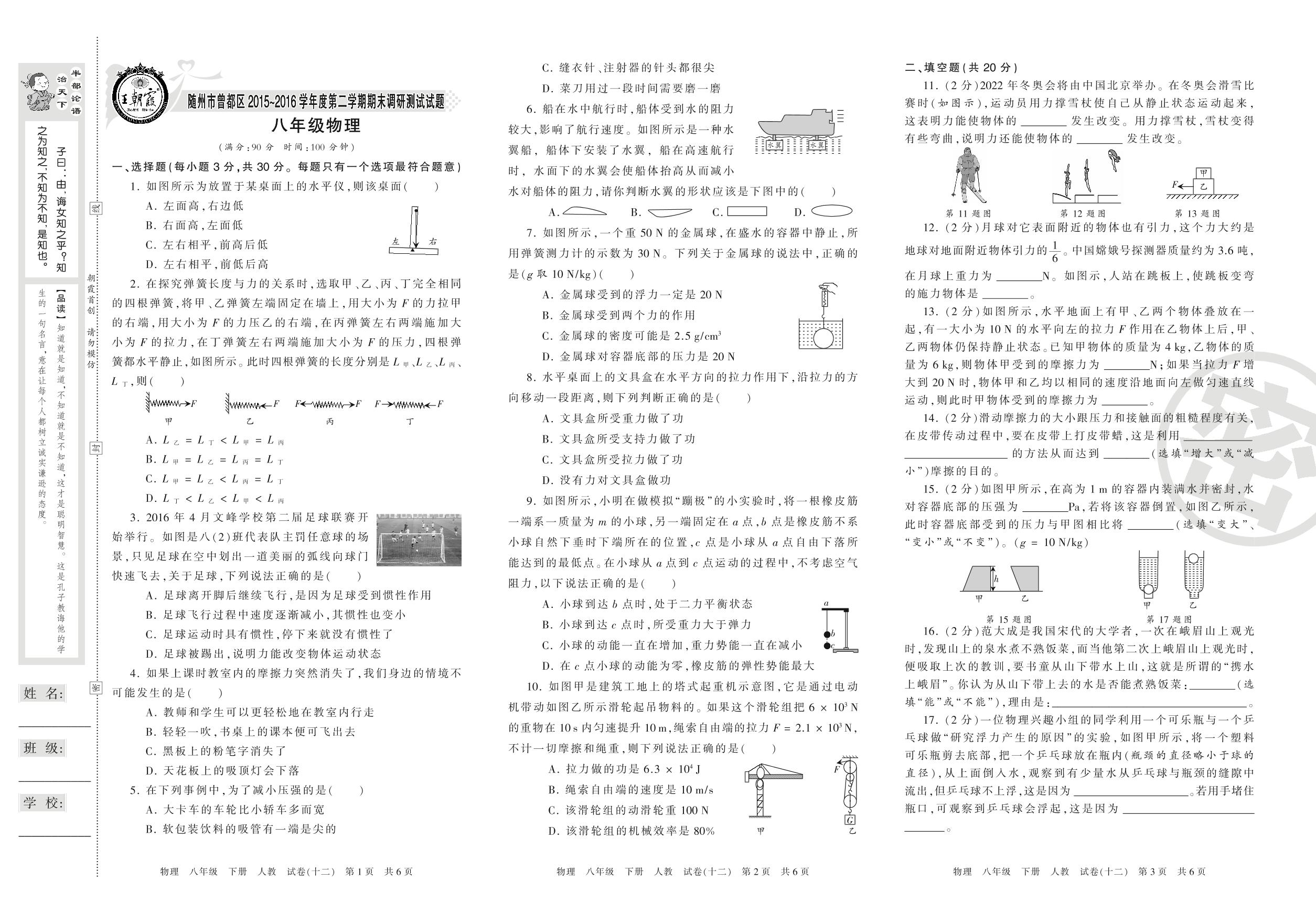 2015-2016学年第二学期随州市曾都区八年级物理试卷(人教版)【12】