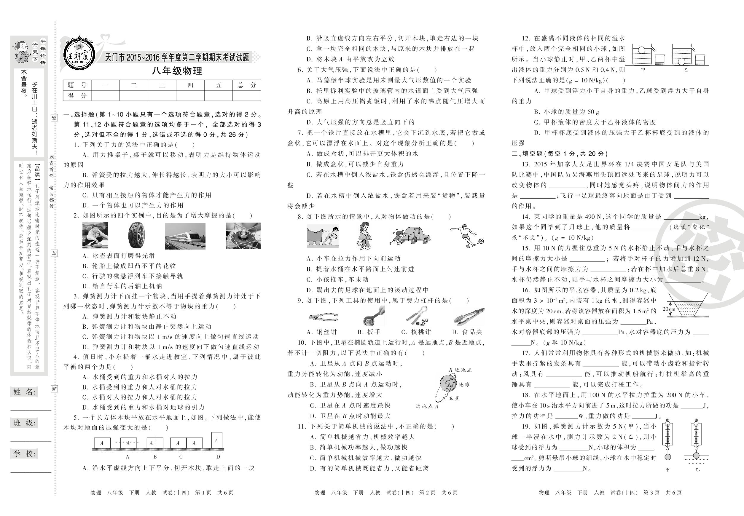 2015-2016学年第二学期天门市八年级物理试卷(人教版)【14】