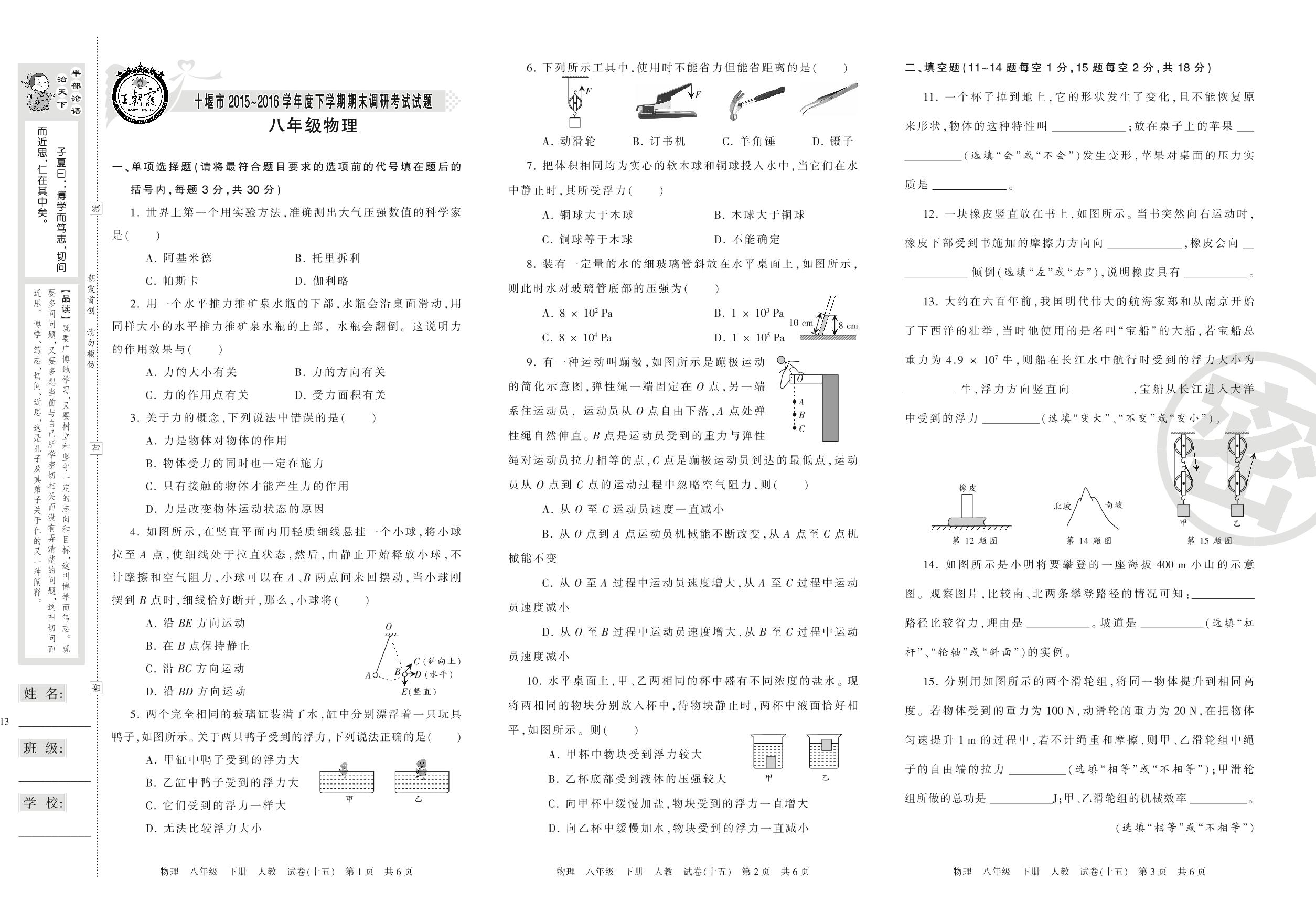 2015-2016学年第二学期十堰市八年级物理试卷(人教版)【15】
