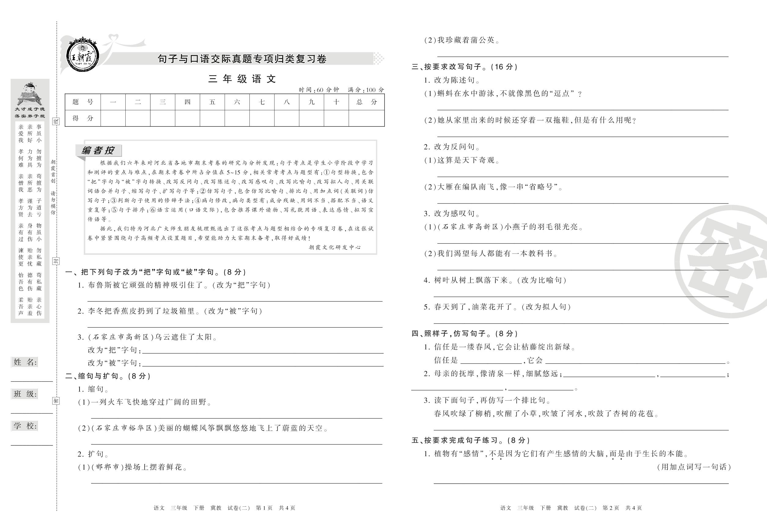 王朝霞期末专项卷三年级下册语文(冀教版)_R21080194017【2】
