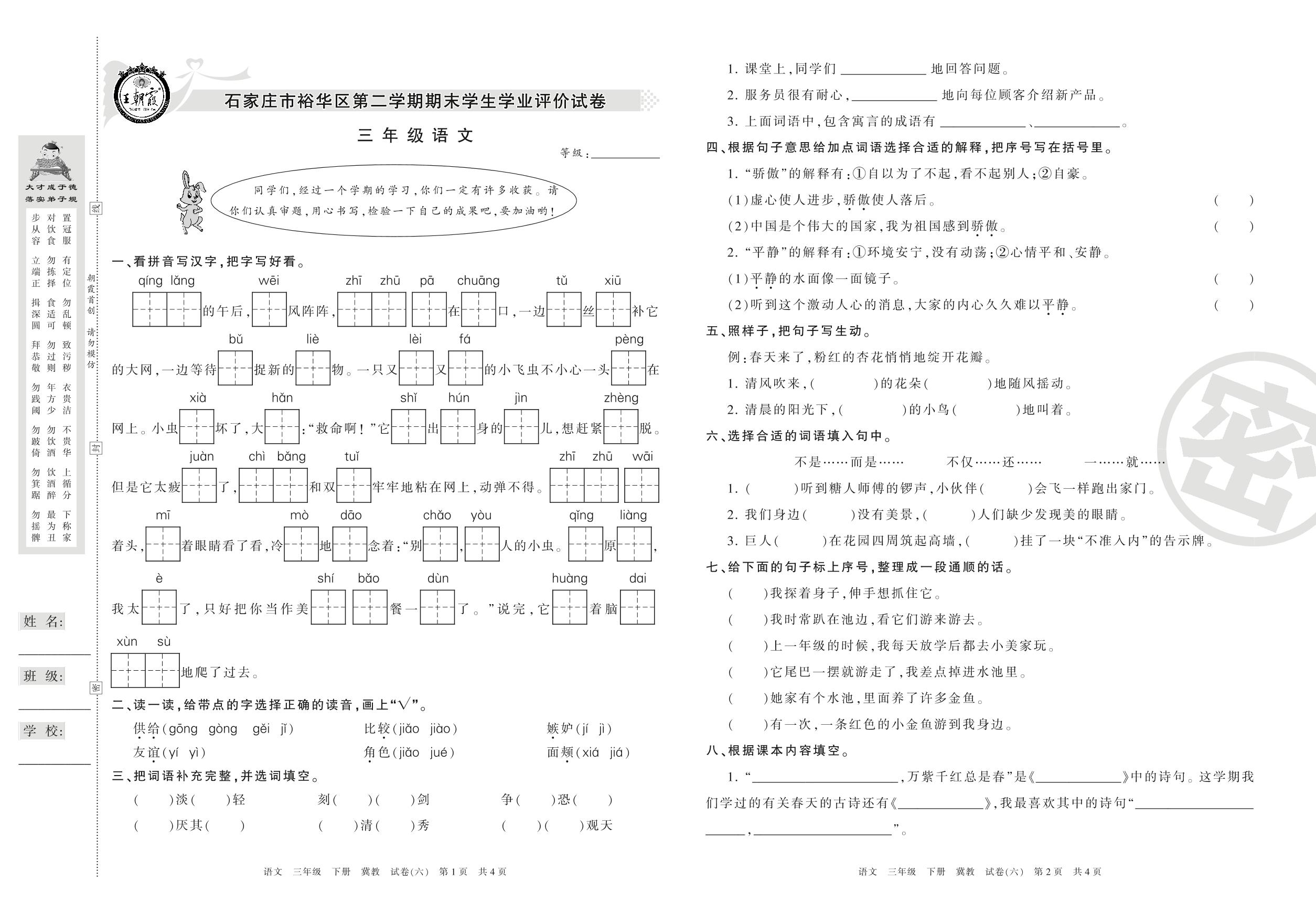 2015-2016学年第二学期石家庄市裕华区三年级语文试卷(冀教版)【6】