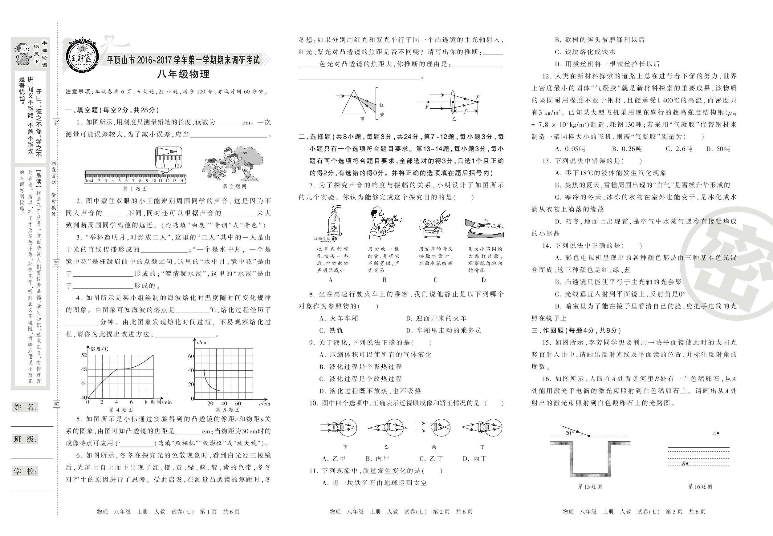 2016-2017学年第一学期平顶山市八年级物理试卷(人教版)【7】