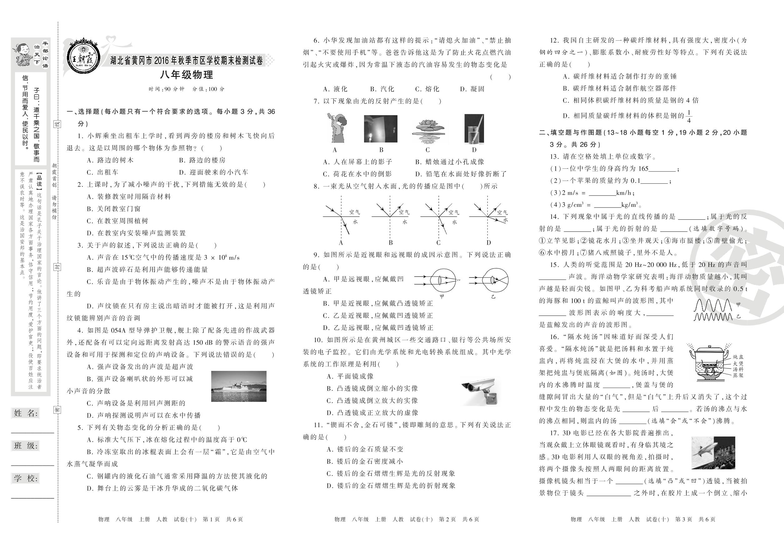 2016-2017学年第一学期湖北省黄冈市八年级物理试卷(人教版)【10】