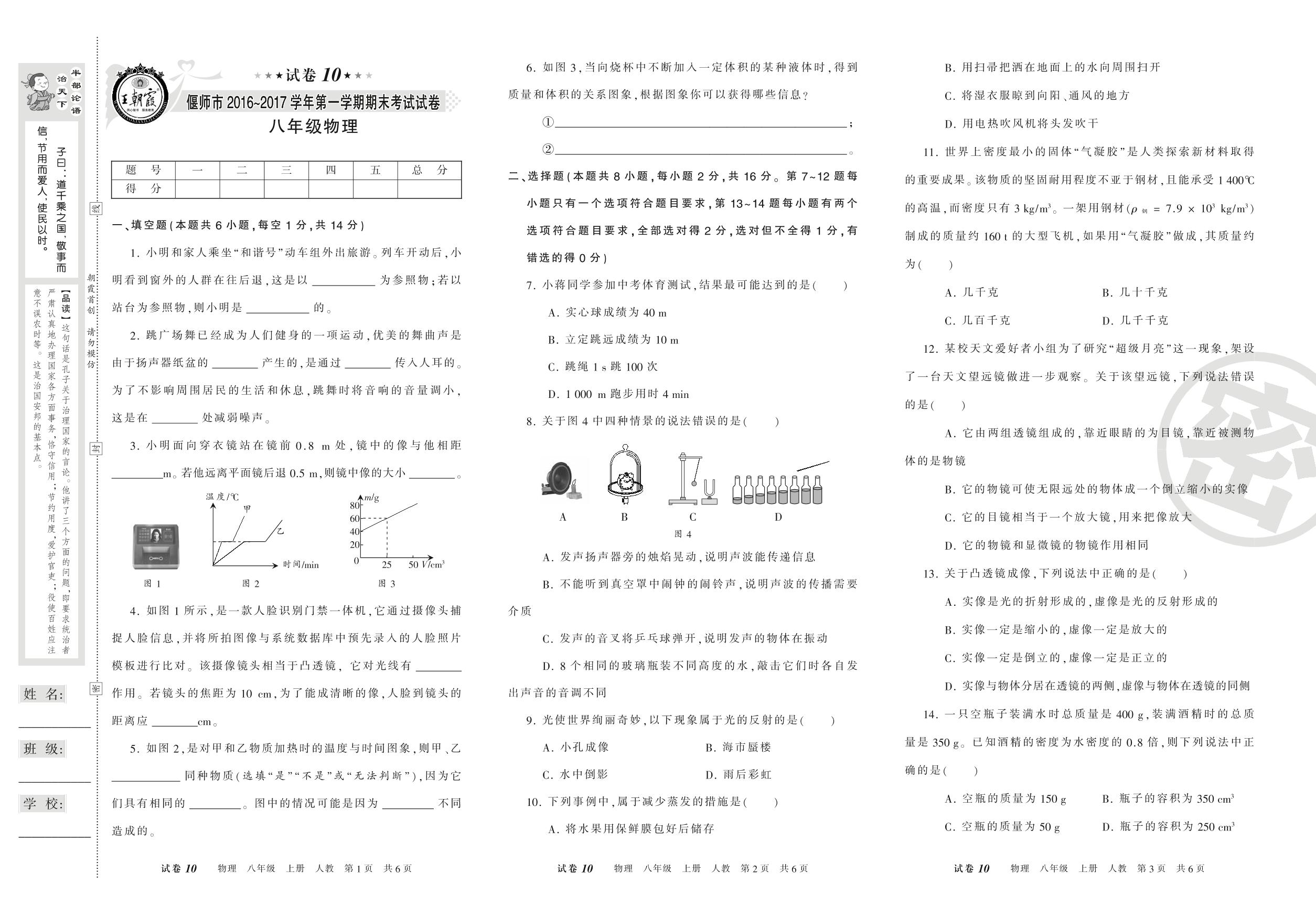 2016-2017学年第一学期偃师市八年级物理试卷(人教版)【10】