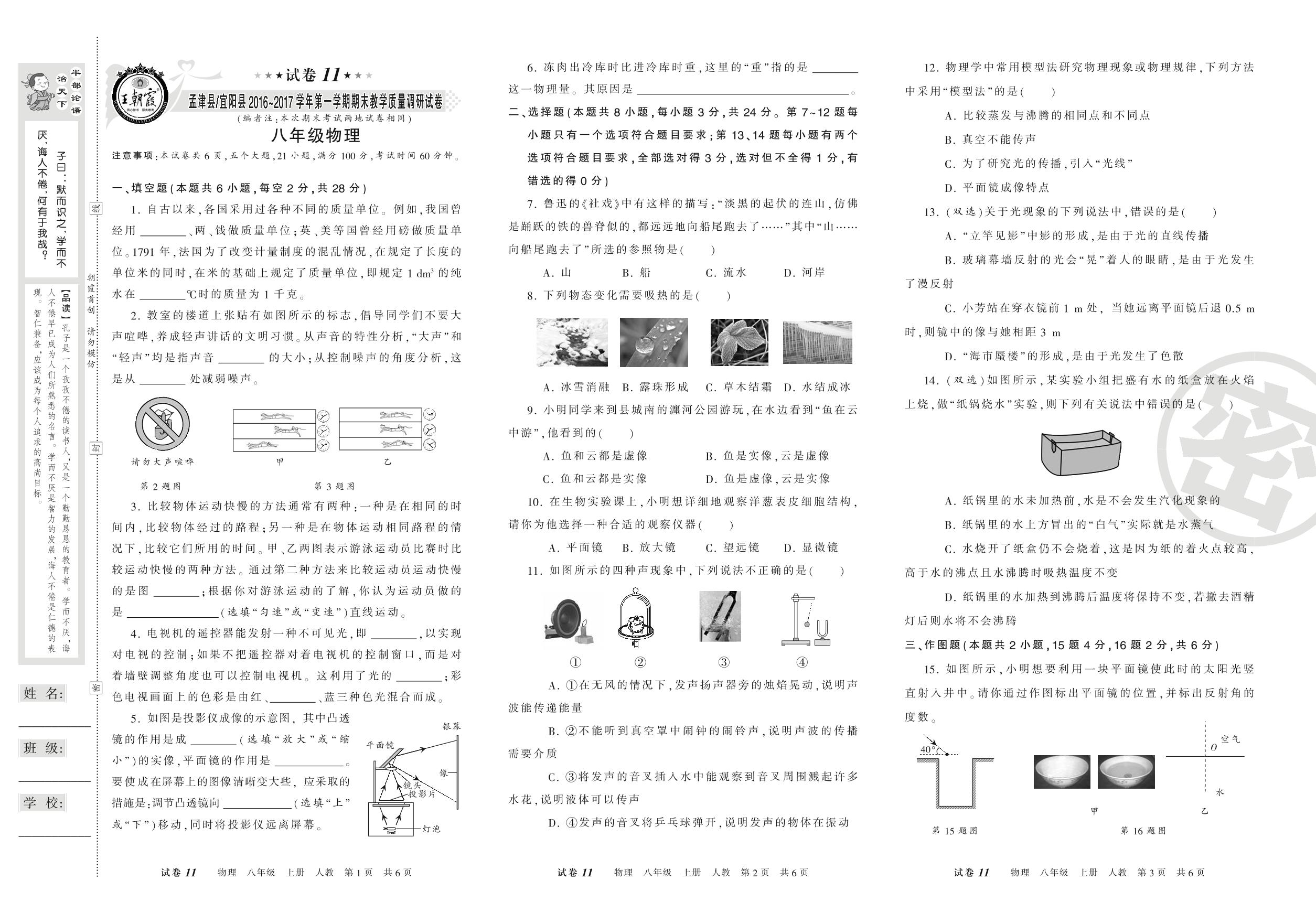2016-2017学年第一学期洛阳市孟津县宜阳县八年级物理试卷(人教版)【11】
