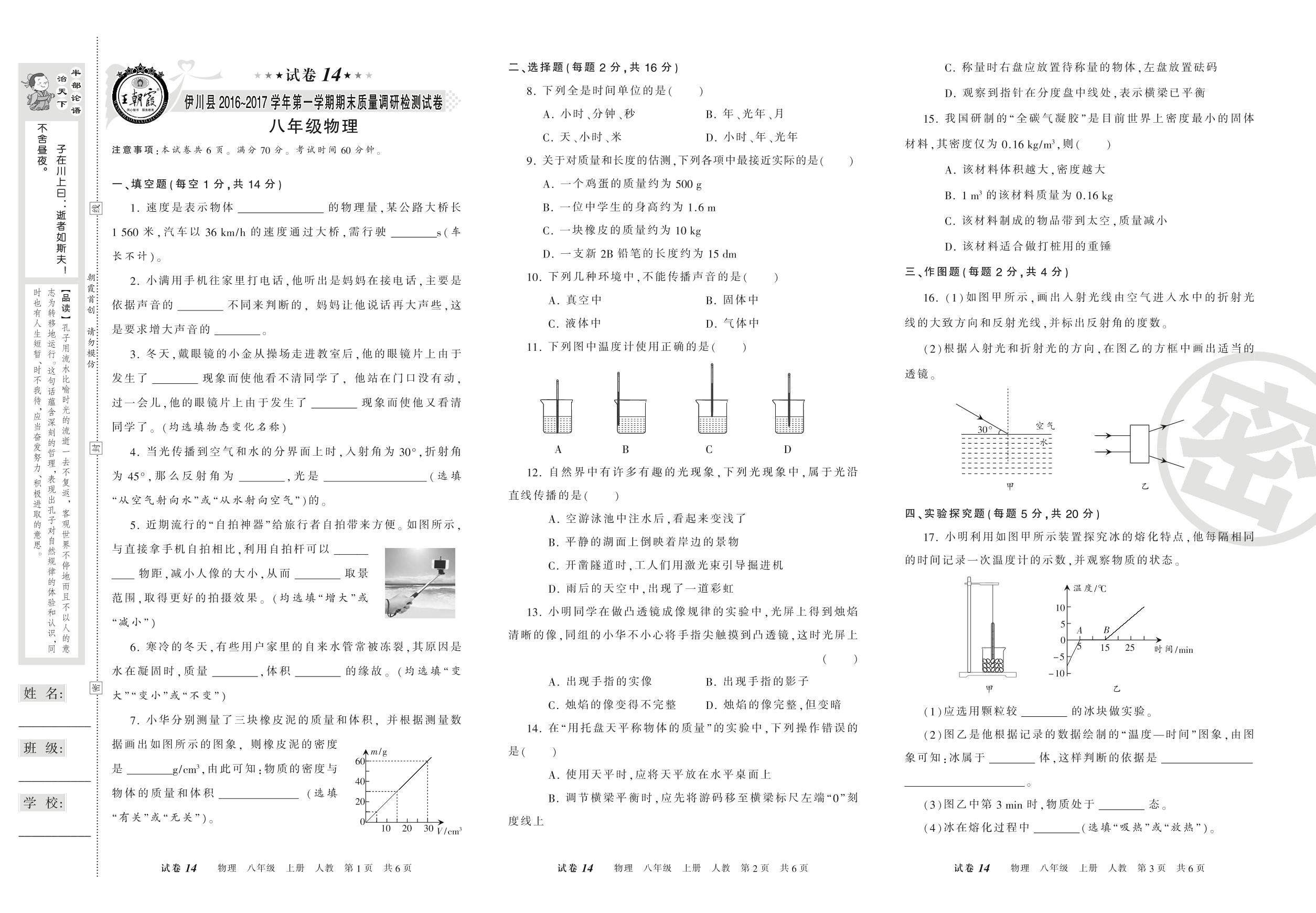 2016-2017学年第一学期洛阳市伊川县八年级物理试卷(人教版)【14】