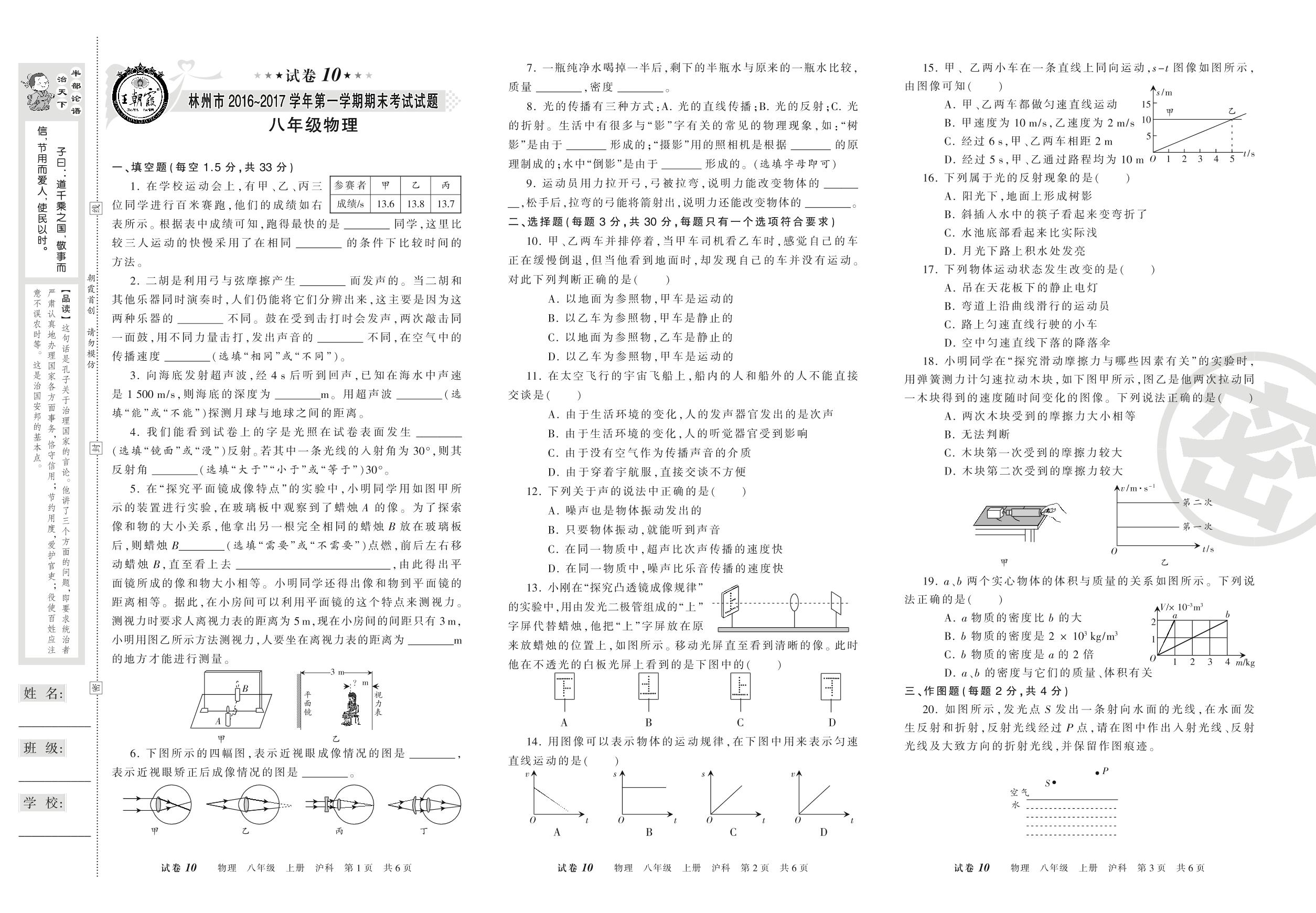 2016-2017学年第一学期林州市八年级物理试卷(沪科版)【10】