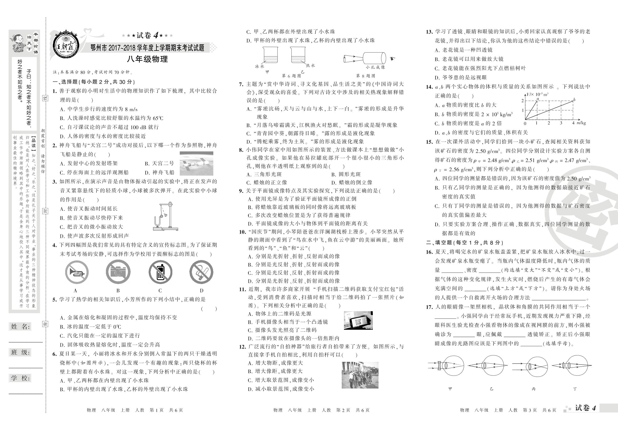2017-2018学年第一学期鄂州市八年级物理试卷(人教版)【4】