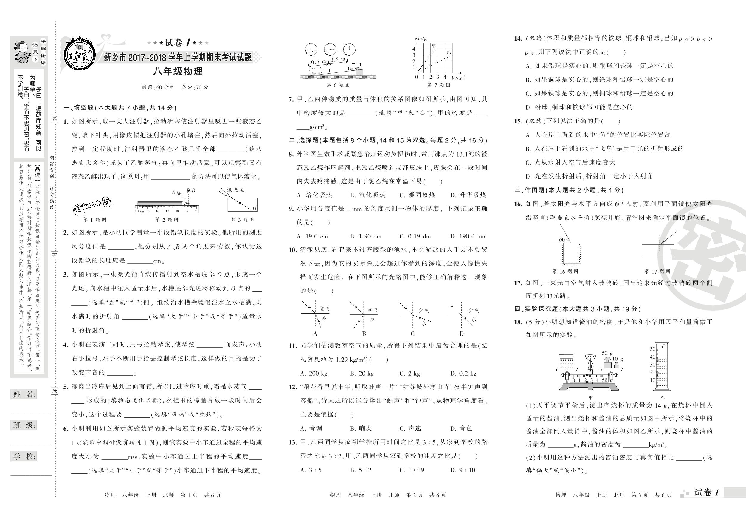 2017-2018学年第一学期新乡市八年级物理试卷(北师版)【1】