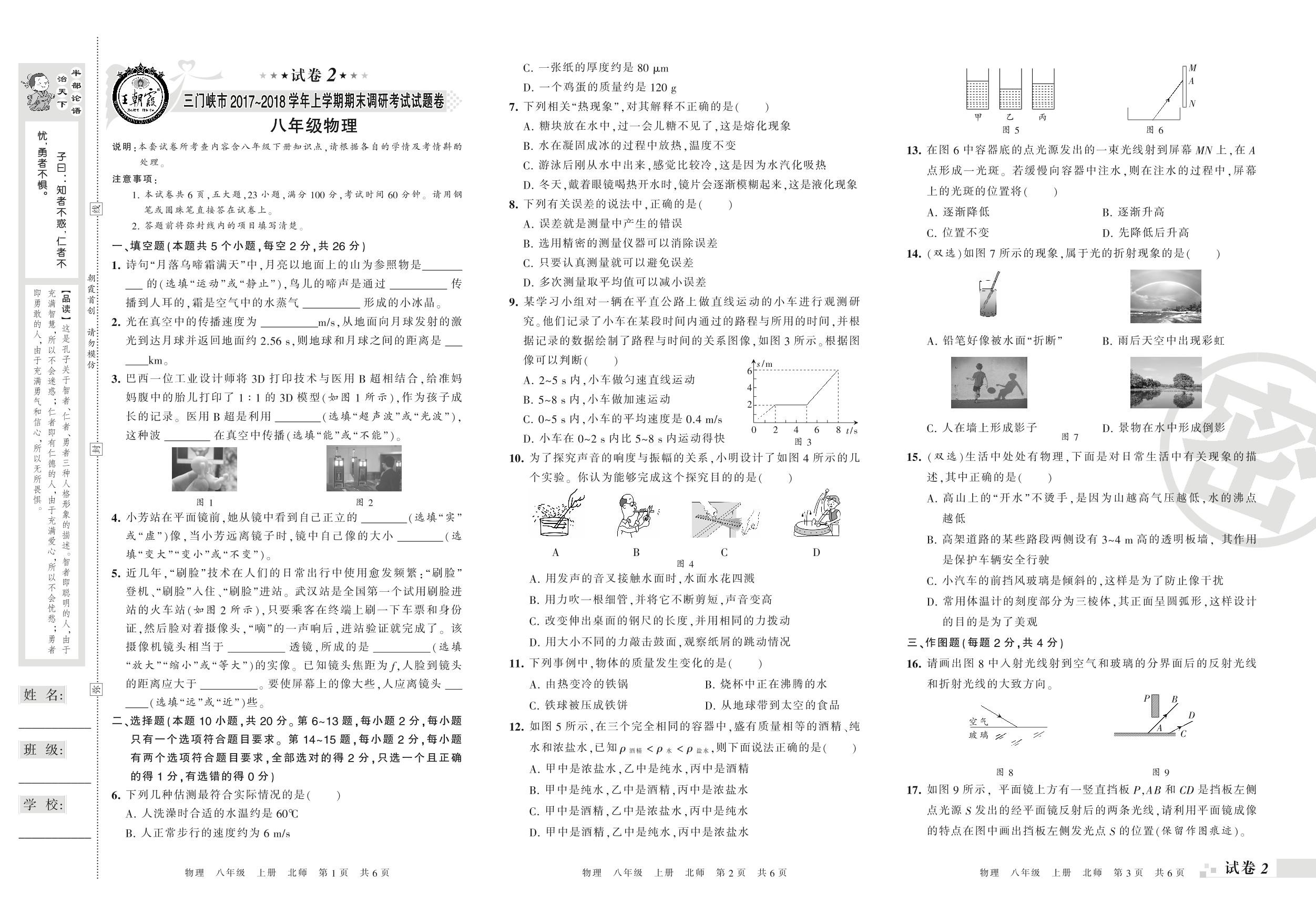 2017-2018学年第一学期三门峡市八年级物理试卷(北师版)【2】