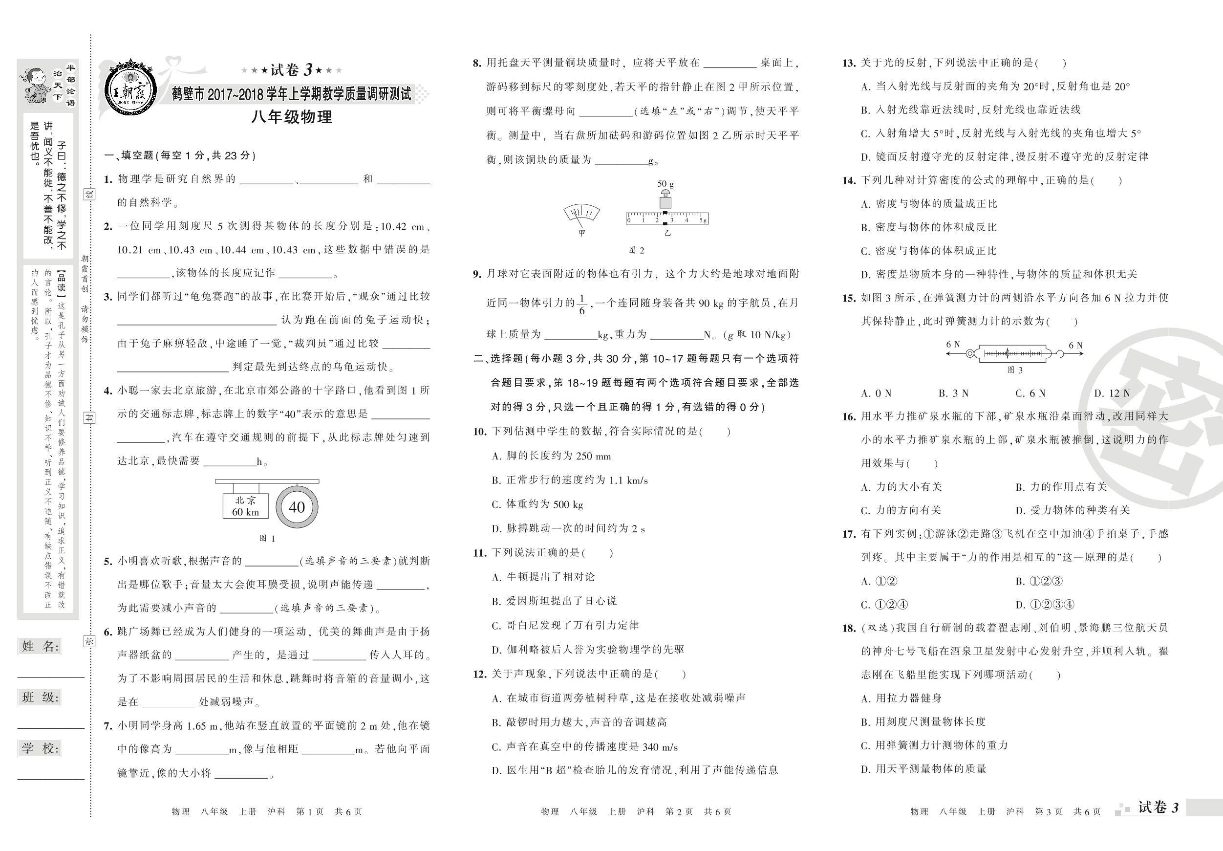 2017-2018学年第一学期鹤壁市八年级物理试卷(沪科版)【3】